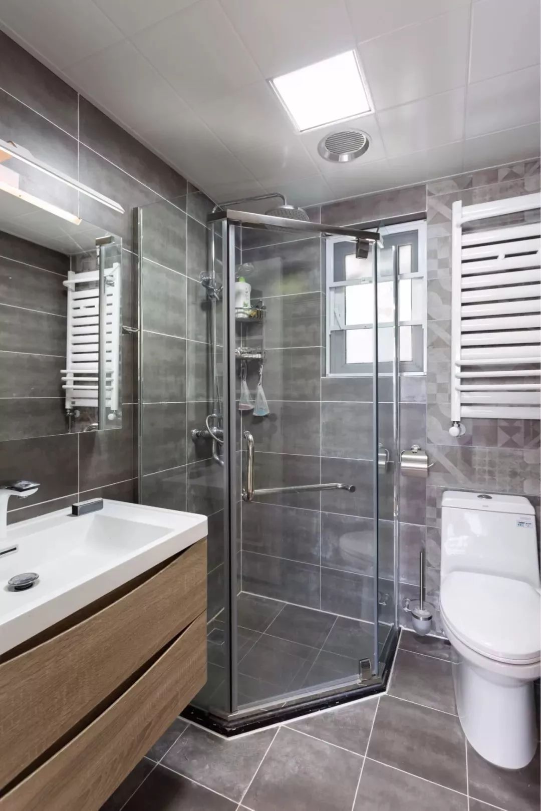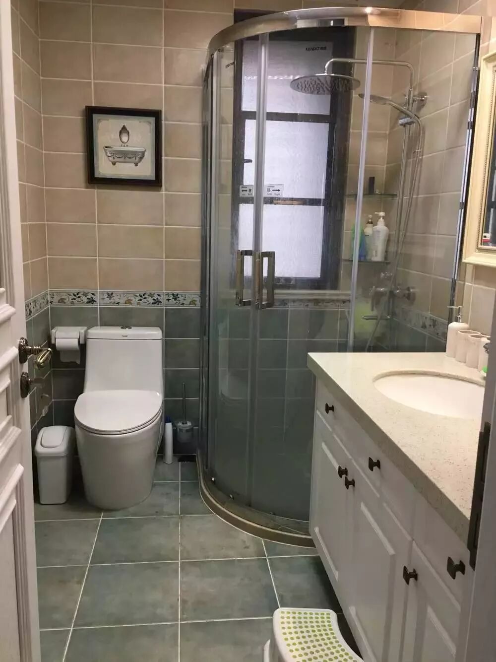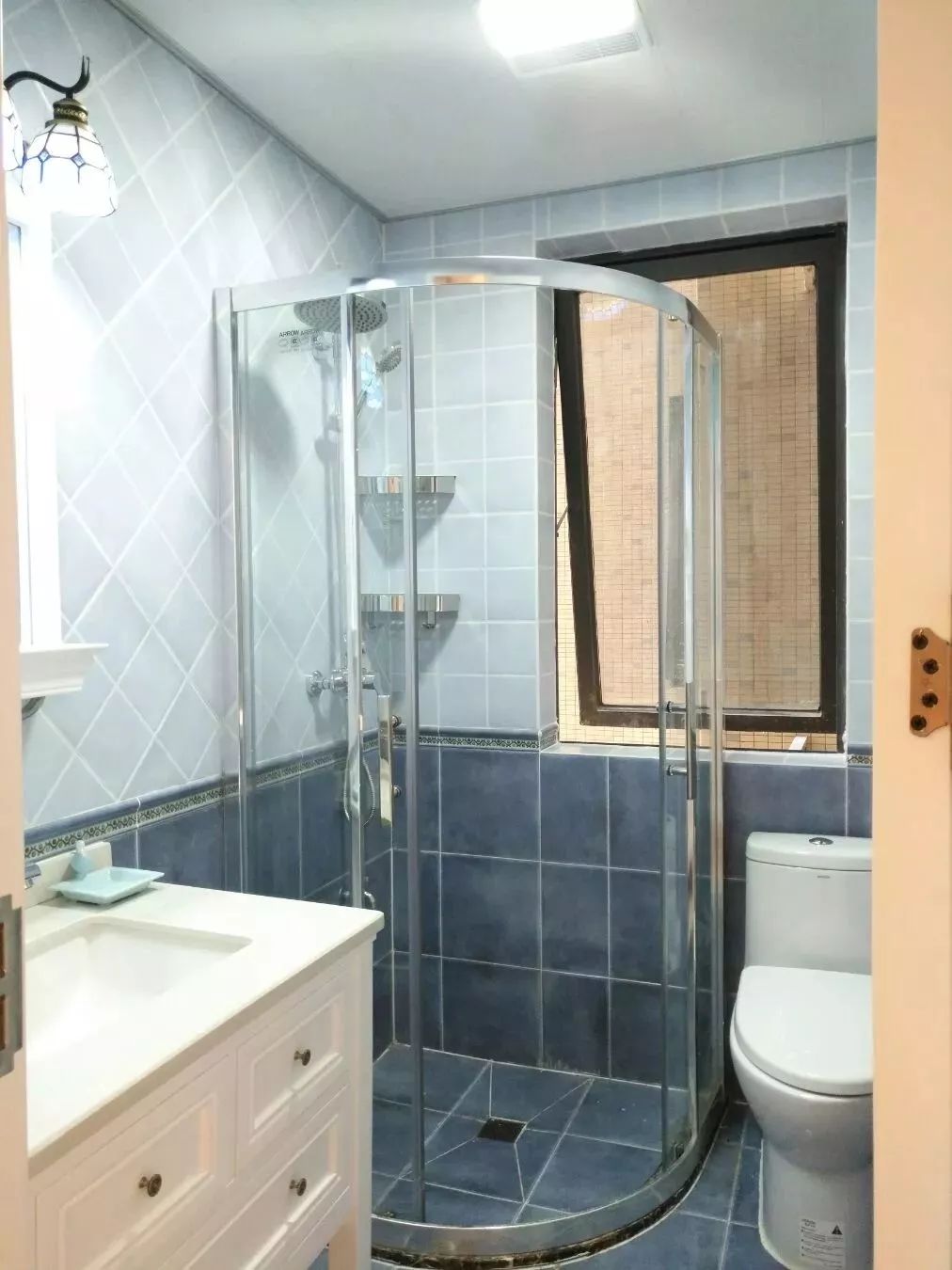 角落的淋浴房小编推荐使用弧型或者钻石型的,一是开关门会更为方便一些,就算往外开也不会撞到浴室柜和马桶。