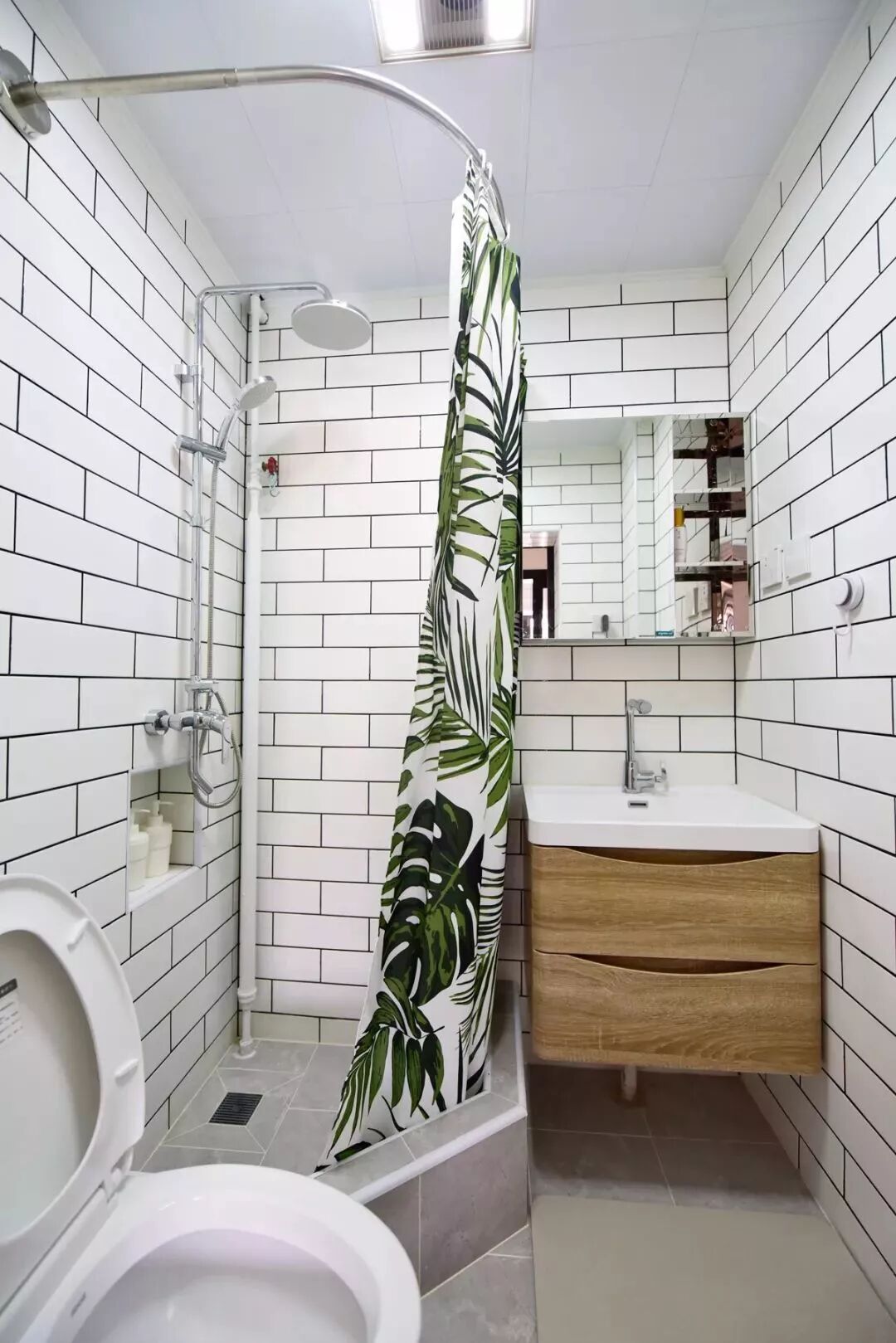 淋浴和马桶放在淋浴区内,然后用一个浴帘把浴室柜给分开,这样能避免木质的浴室柜受到水汽侵蚀发霉,在清洁的时候会方便一些。