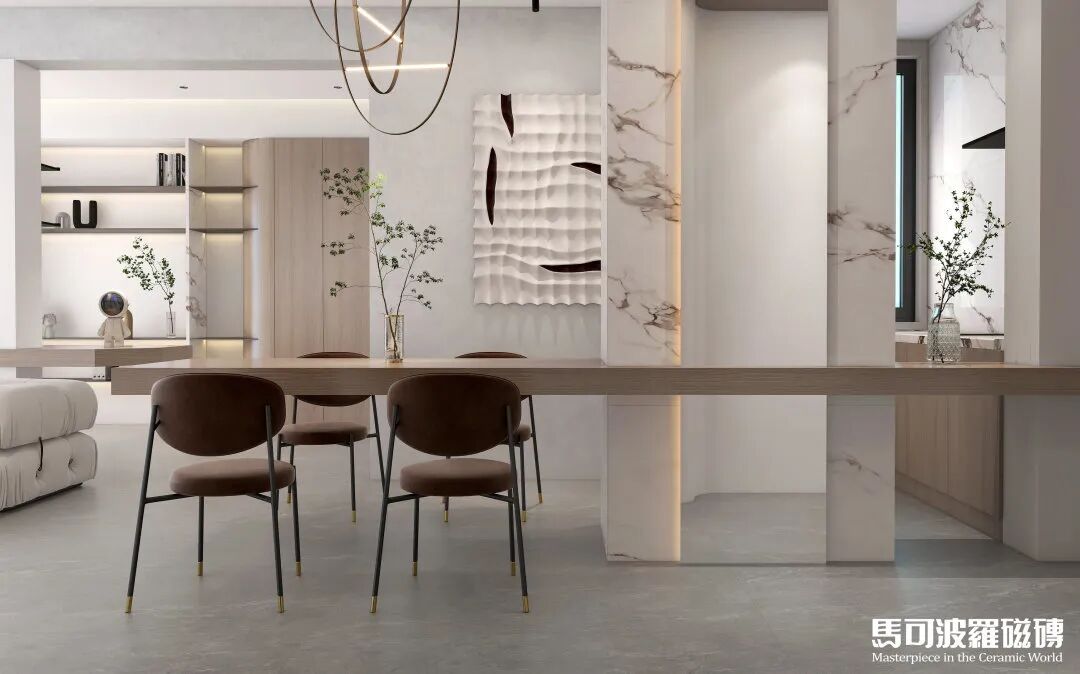 餐厅墙面与电视背景墙面,选用马可波罗2023年新品岩板科莫白金,底纹有着阿尔卑斯山脉白雪般的纯净,纹理珍贵而自然,营造典雅舒适的空间氛围。