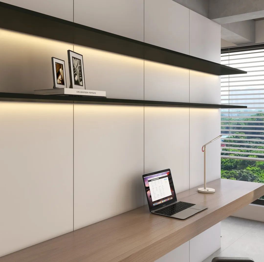 开放式书房既能满足办公的需求,又能方便和家人的交流互动,墙面黑色金属隔板架。可以放置展示各种装饰品与书籍等,质感十足。