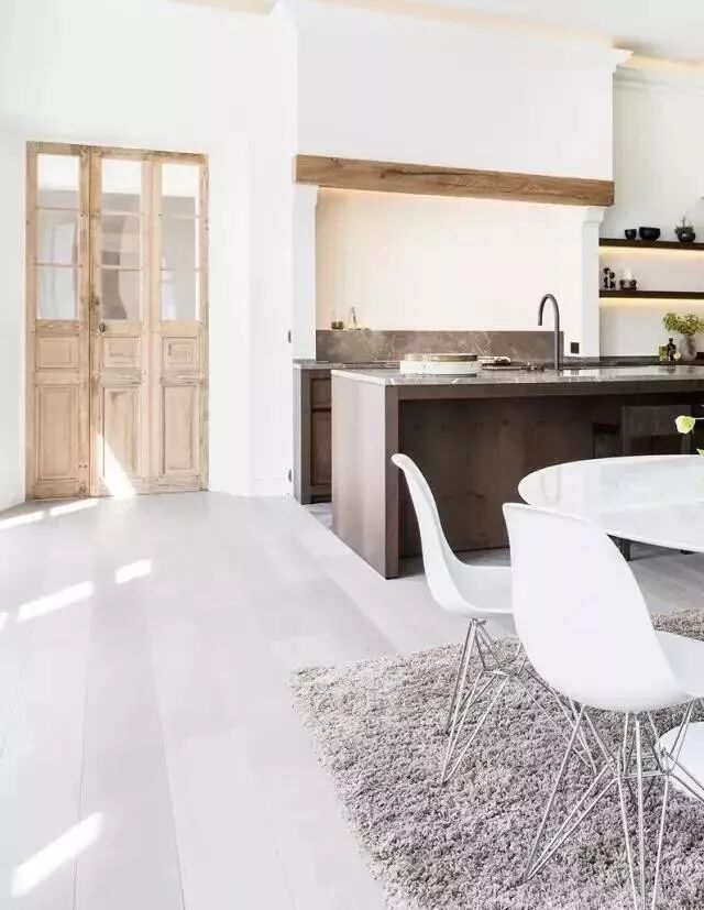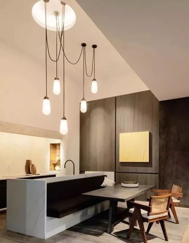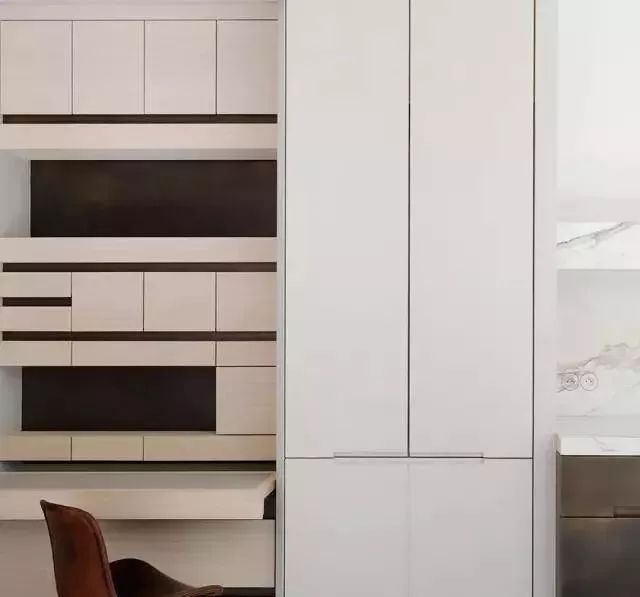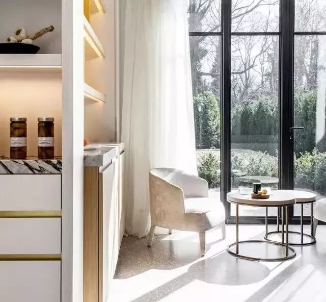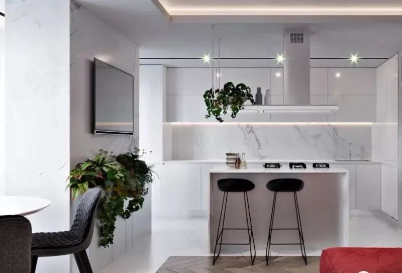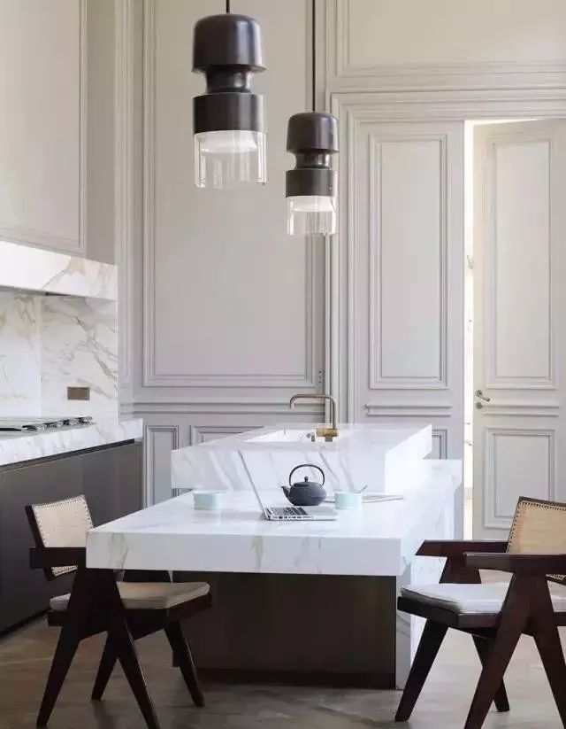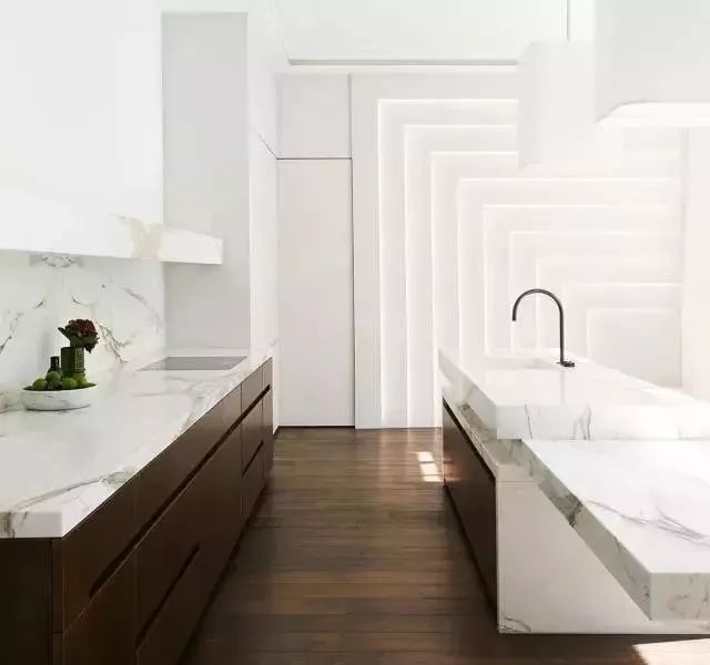 中岛台用白色大理石悬挑的中岛台用白色大理石更加轻盈而富有美感。