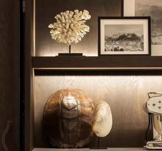 厨房岛台的台面使用的是大理石,凭借高超的工艺,将材料与功能结合形成了完整的操作台,同时其温润的材质提供了一个亲切又精致的料理空间。
