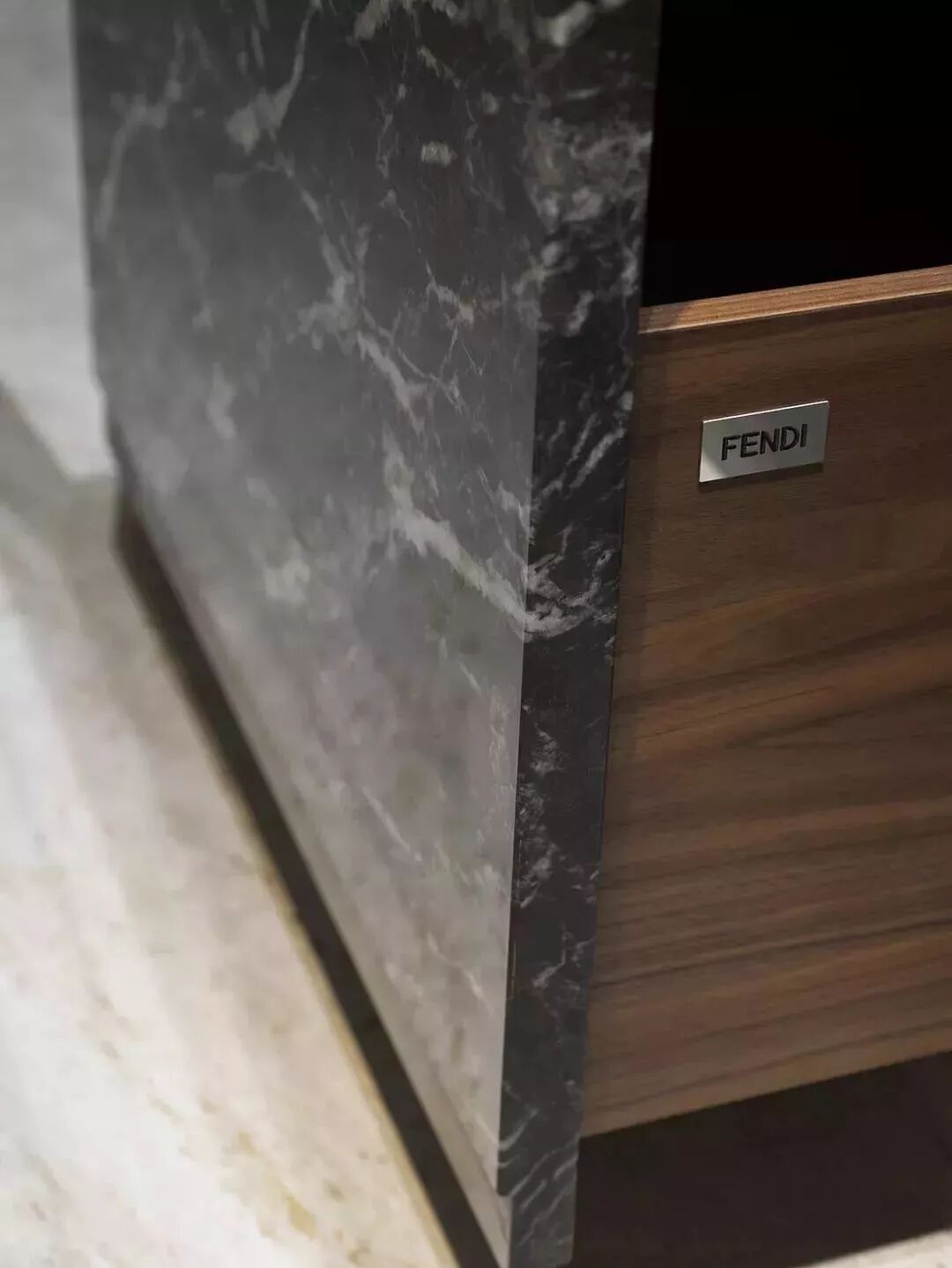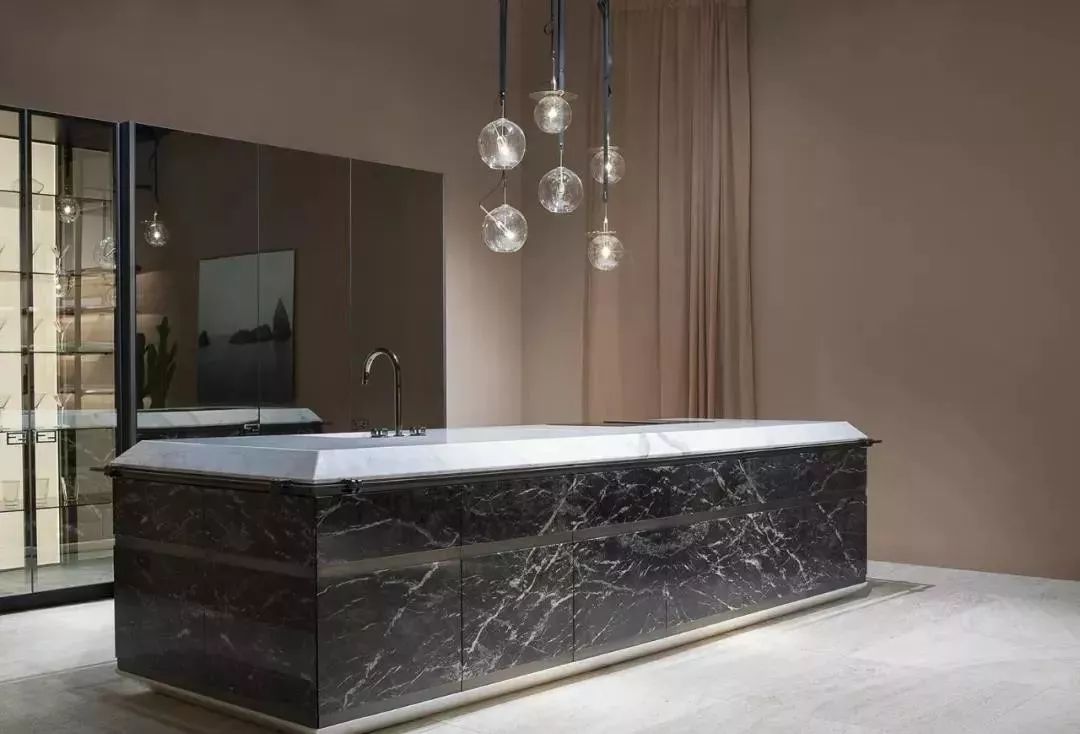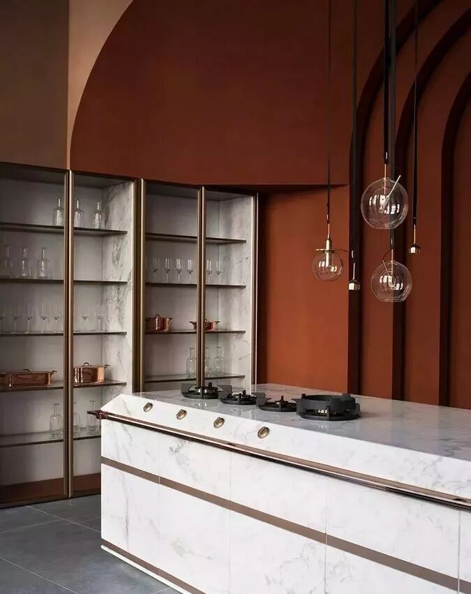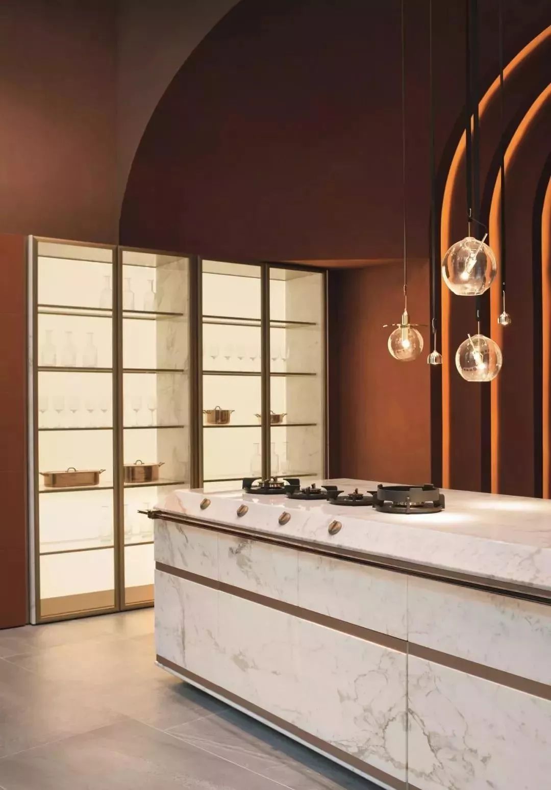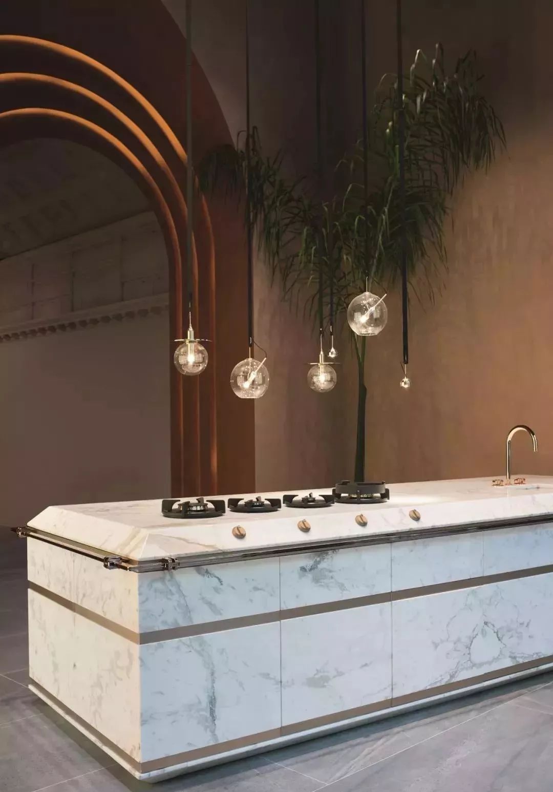 Ginger采用大理石和青铜金属的结合,创造了一种良好的感觉和轻松的气氛。成熟的大理石外观与厨房岛台的雕刻设计完美的结合在一起,通过倾斜的台面、踢脚板和没有把手的门的设计加强了特色。