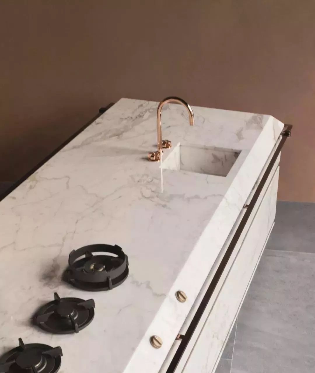 Kurkum 系列大理石与不锈钢Kurkum 系列的设计核心是要打造一个「专业级的厨房」,但同时又要保证拥有艺术般的美感。这个系列有着非常精巧复杂的细节,所以透露出一种科技感,这是得益于冷峻的不锈钢。