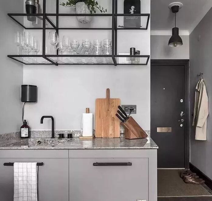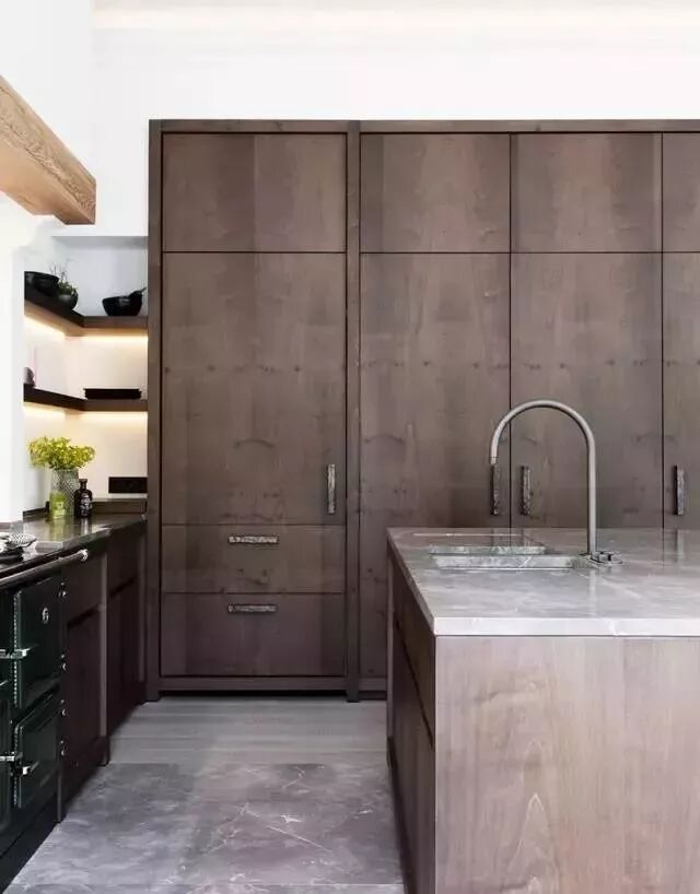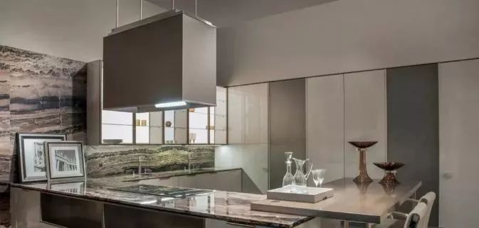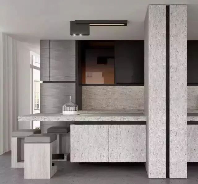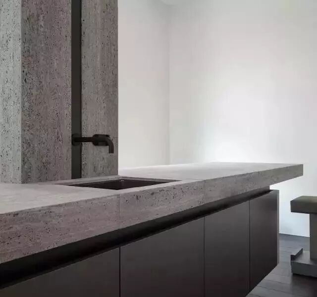 裸露的灰洞石材质配以简洁单一的线条,整个设计几乎看不到橱柜拉手和隔板。不过洞石虽然好看,但是并不适合用于我们国人厨房台面。