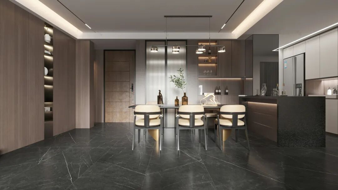 想打造开放式格局,就需要将客厅、厨房、餐厅之间的隔断通通去掉,选750*1500mm系列瓷砖全屋通铺才是彻底收获显大又通透空间的关键。浅色系色调,搭配简单纹理,不仅从视觉上规避了空间小的缺陷,更加充满温馨与浪漫。