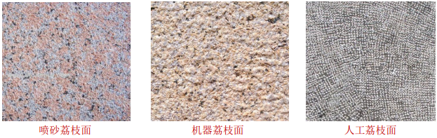 石材荔枝面加工是用形状如荔枝皮的锤在花岗岩表面敲击,或用凿子在花岗岩表面上密密麻麻的凿出小洞而成,从而在石材表面形成形如荔枝皮的粗糙表面,多见于人行道表面或广场地铺等。