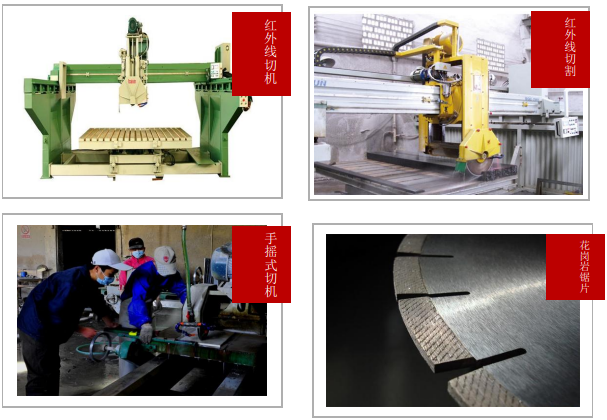 切机主要用来加工石材的成品和半成品。红外线自动切机采用可编程控制器控制技术,内部电路对运动距离进行精确定位(理论精度 1/1000mm),使得加工精度能够小于 0.2mm,能保证加工几何尺寸的准确;