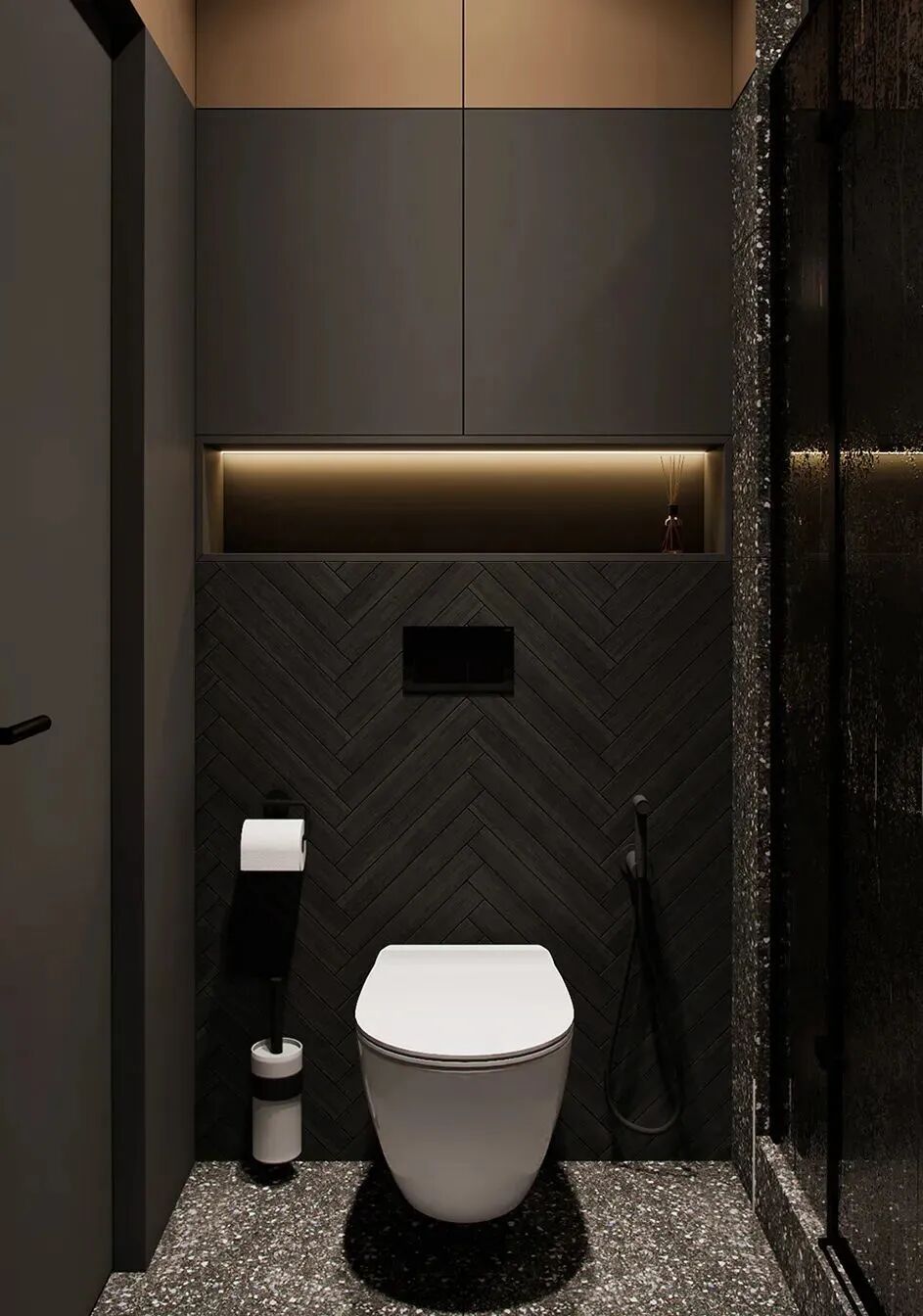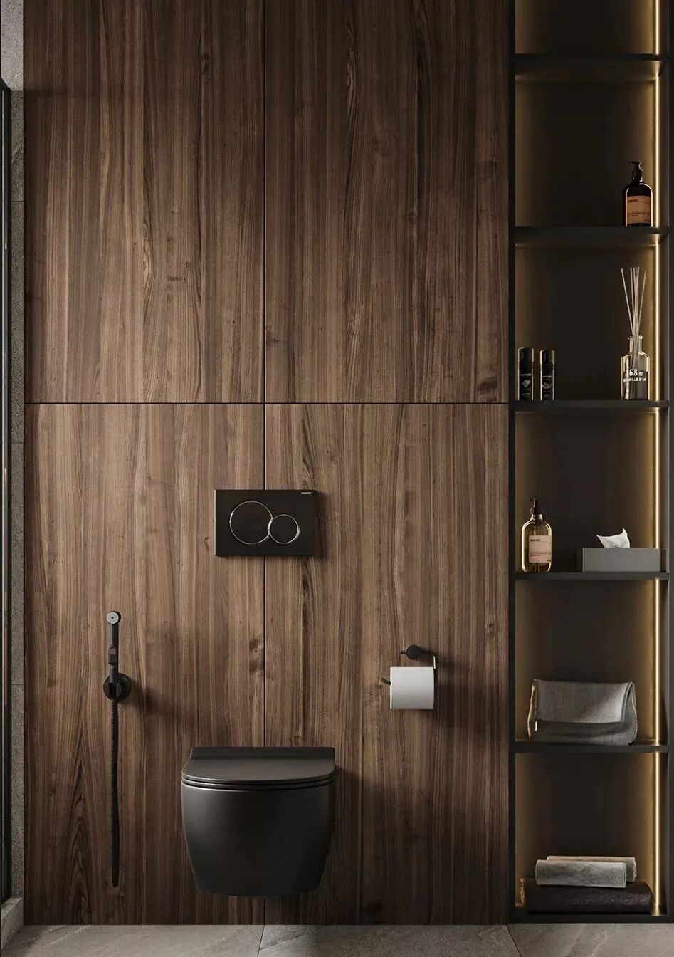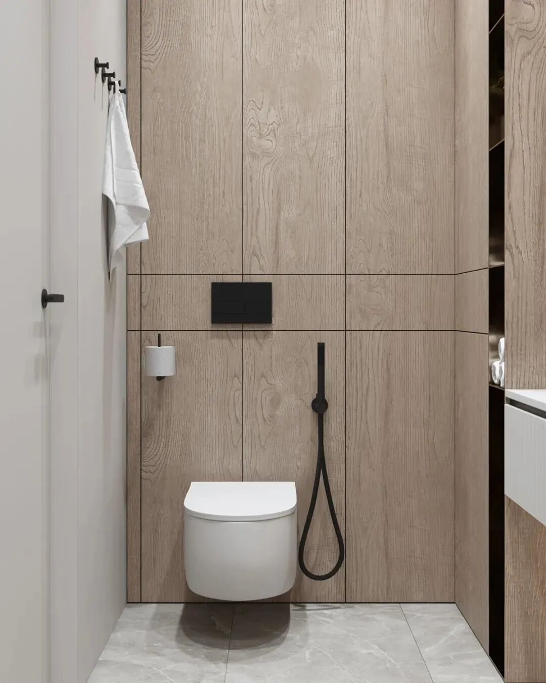 卫浴空间以黑色卫浴与木饰面完美相融,延伸出收纳及护墙系统,让小空间变得轻朗而静谧。