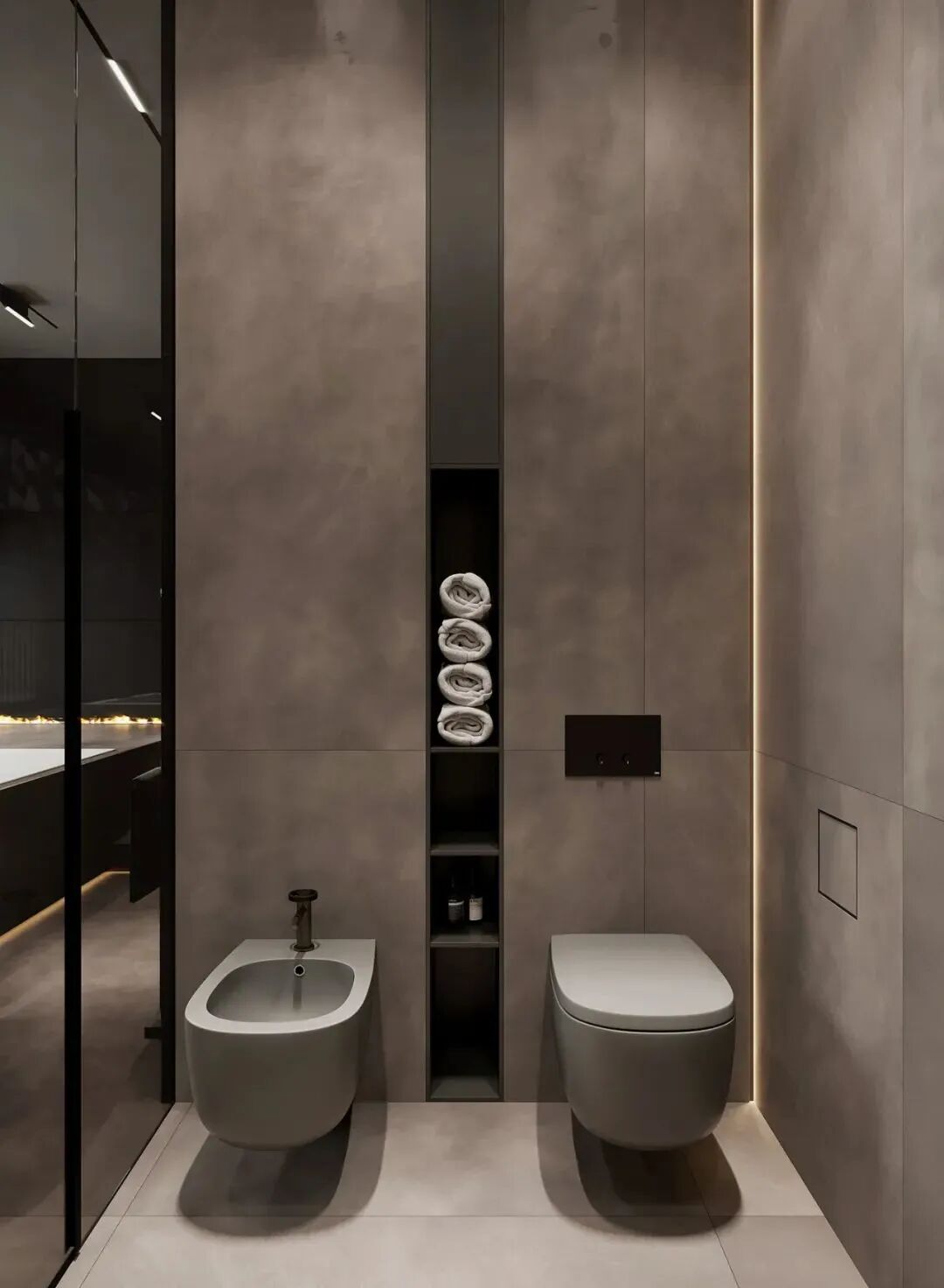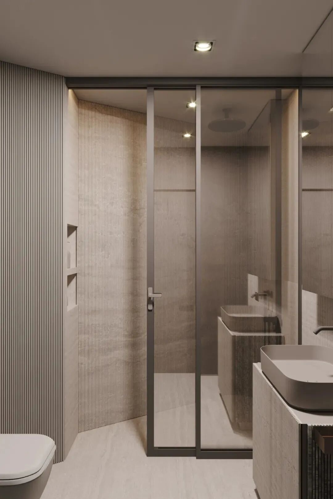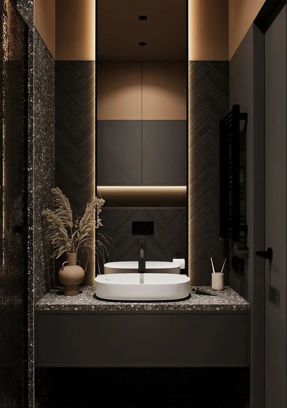 卫浴以暗色调为渲染,铺设出简洁有序的洗漱区、