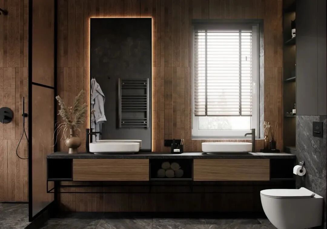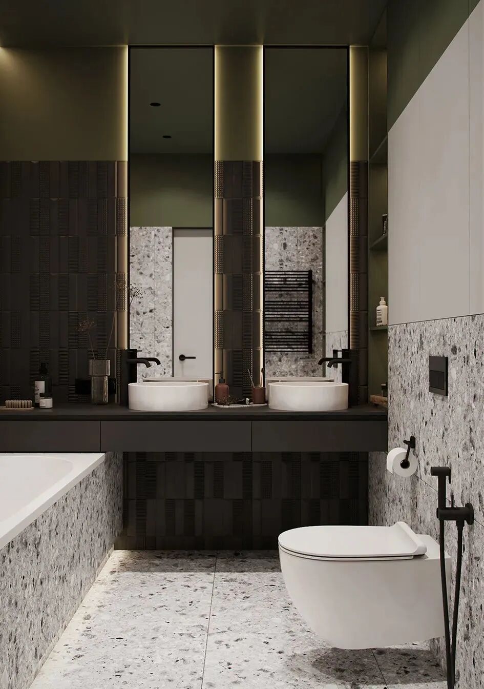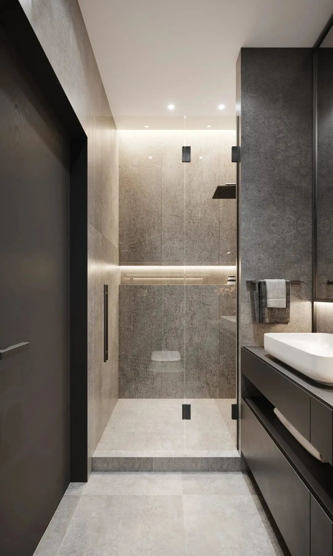 卫浴以暗色调为渲染,铺设出简洁有序的洗漱区、