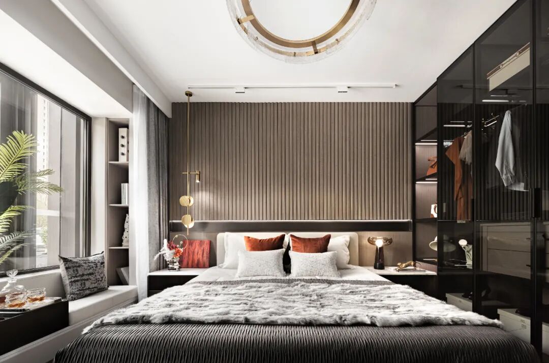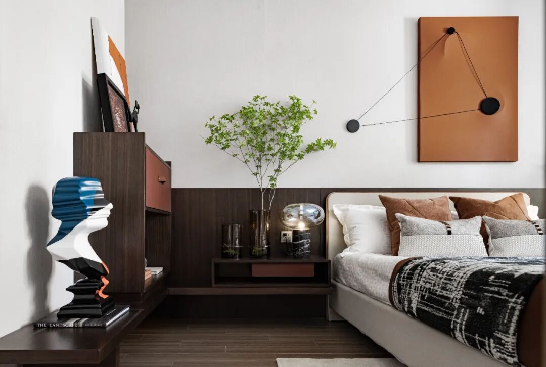 主卧没有繁复的装饰,设计以棕色调赋予空间宁静、深沉的舒适感,午后的阳光透过薄纱映入空间,温暖而不耀眼,在保障了私密性的同时感受四季的变化。