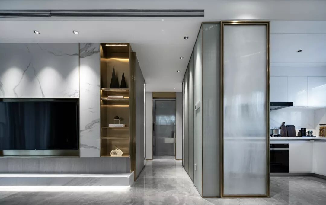 空间本没有风格,通过不同元素/材质的组合,产生不同的空间氛围,有品质的材料,会让普通的空间变得超凡脱俗。本案业主追求安然、雅致的生活氛围,整个空间,选择了舒适度极高的灰与白为主色调,在材质上,大面积采用了莫地卡灰通体大理石瓷砖铺贴地面,自有一番大自然的艺术气息,精致的金属与皮质元素点缀于空间之中,打造质朴而隽永的“黑白灰”生活空间。