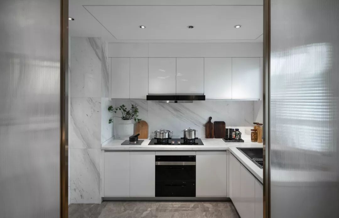 厨房、餐厅与客厅光线共用,开阔视野的同时,让整个空间通透明亮,这里依然铺贴了灰色大理石瓷砖地面,保持了空间的整体性。餐桌上的玻璃容器,透露出主人对待精致生活的热爱与认真。