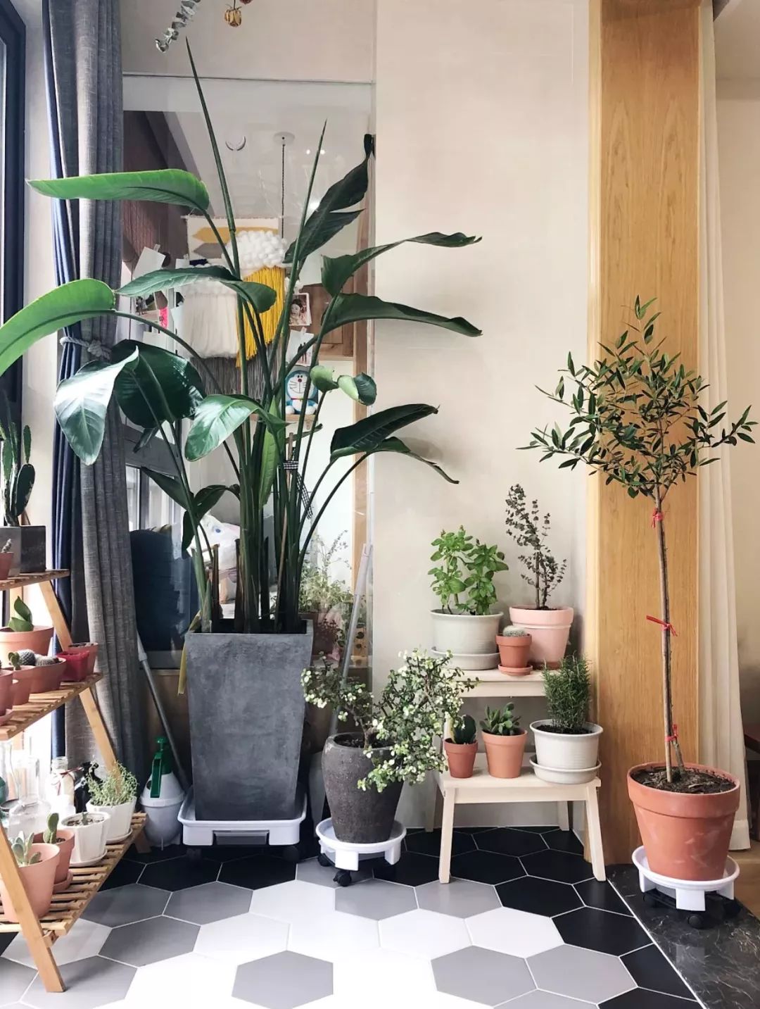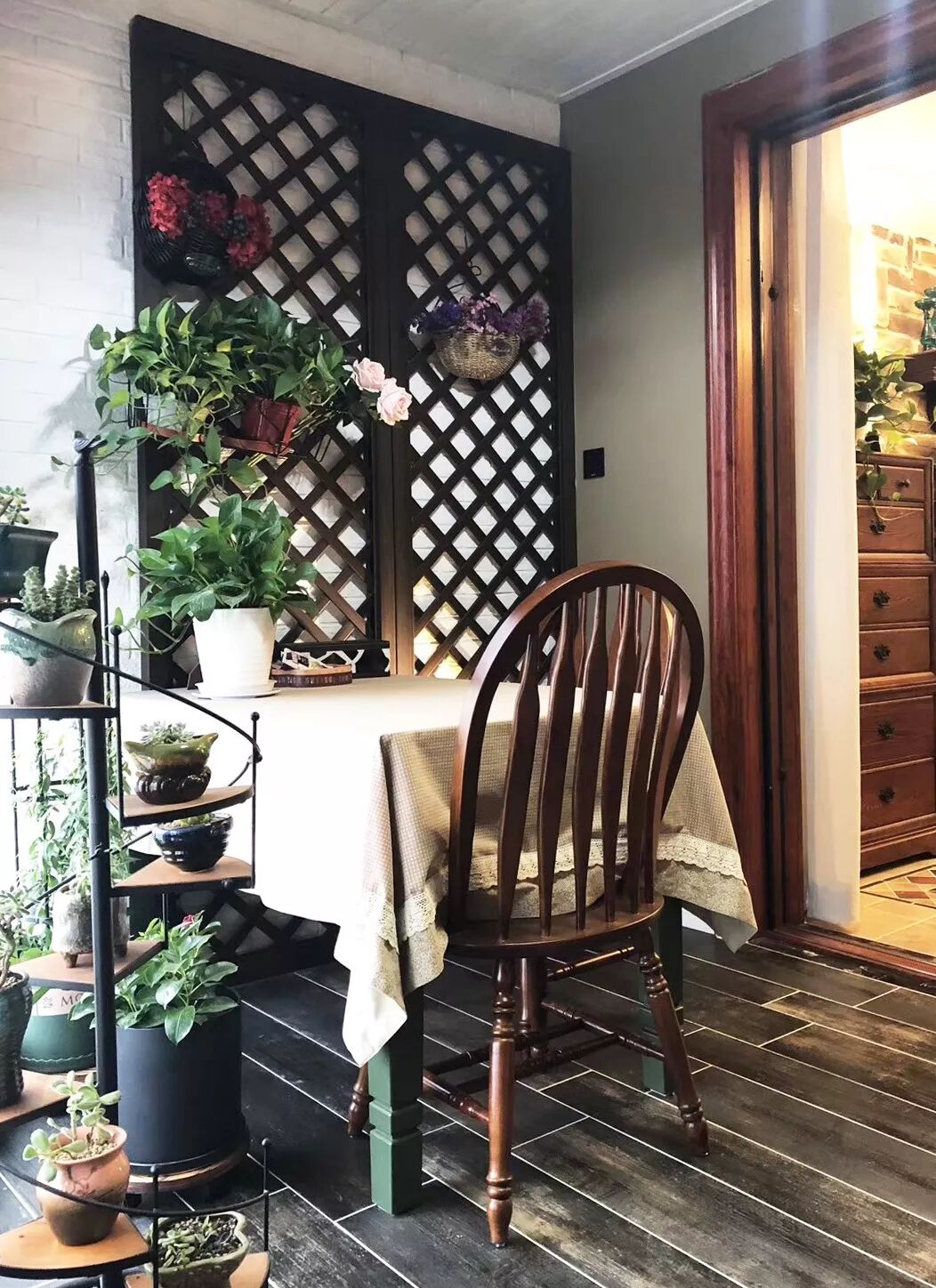 ▲阳台地面铺设意大利IMOLA瓷砖INEDITO系列木纹砖,配以简洁内敛的黑灰色调,以及清新文艺的绿植与花朵,在自然环抱的舒适氛围中,享受静谧与安逸。