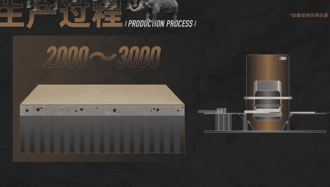 陶瓷大板、岩板需要使用10000吨以上压机压制,这相当于两三千头成年亚洲象的重量压在身上。因此,它的致密度极高,吸水率接近于0,污垢更是难以渗入。