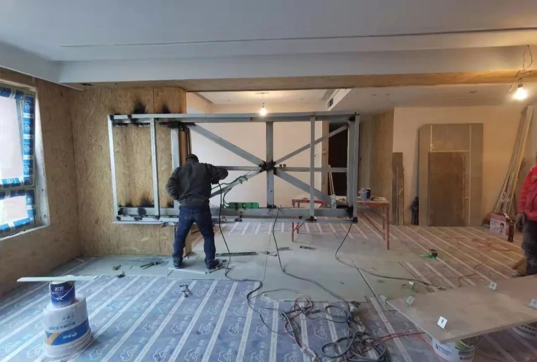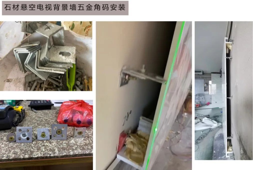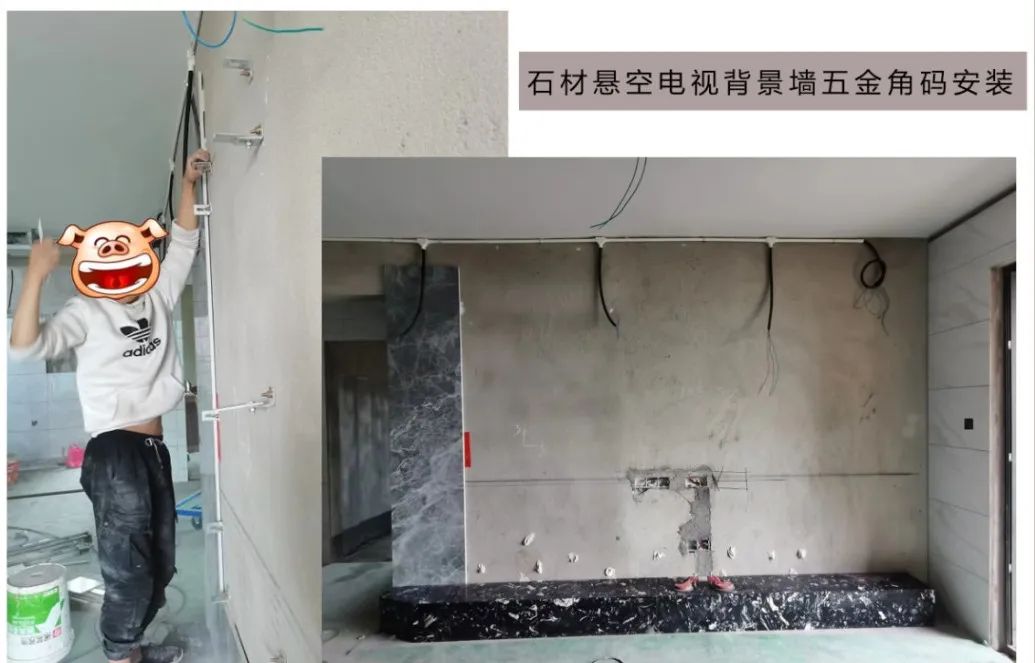 这种悬空背景墙安全性至关重要,需要在墙上牢牢固定钢结构,才能保证背景墙不会掉落。看下图。