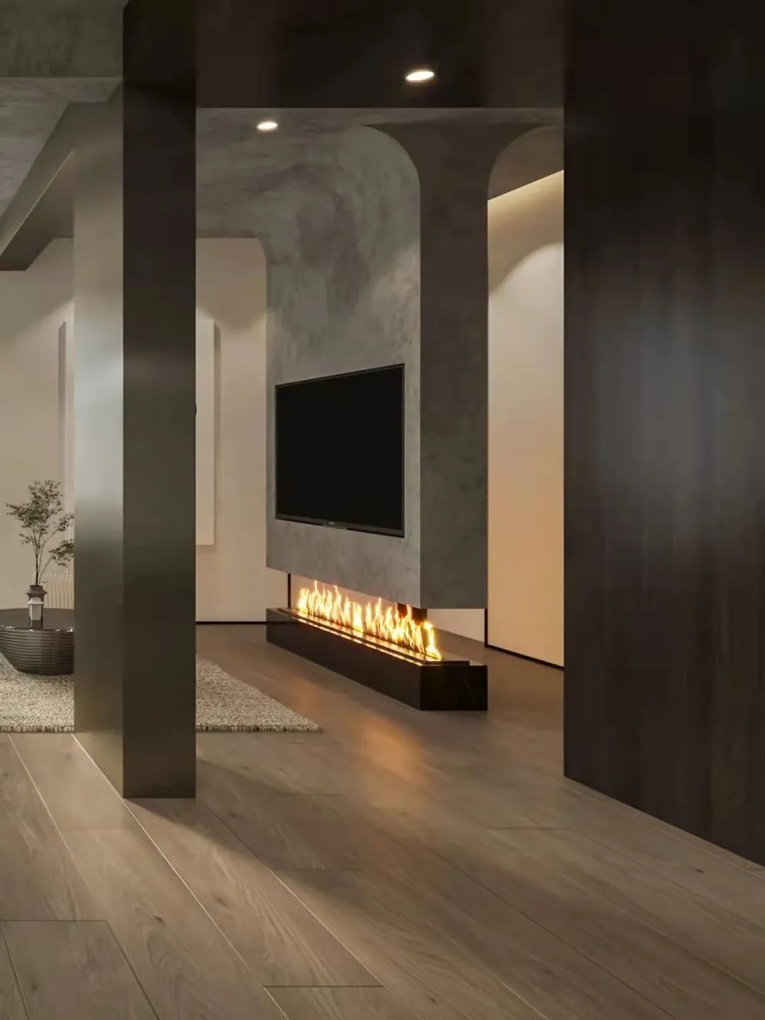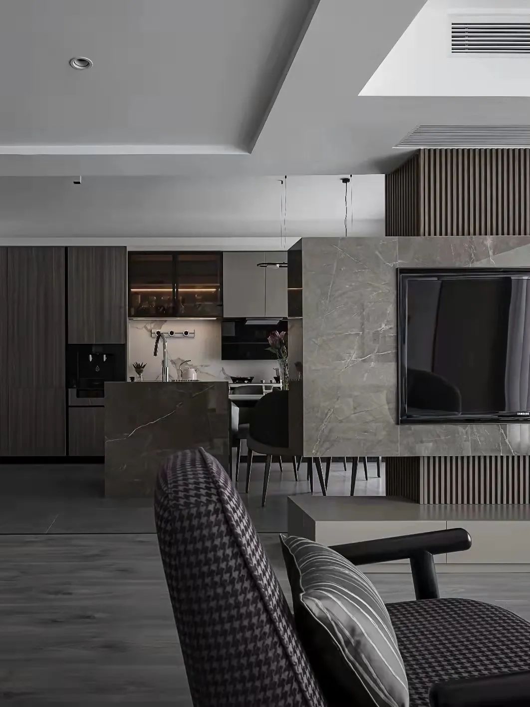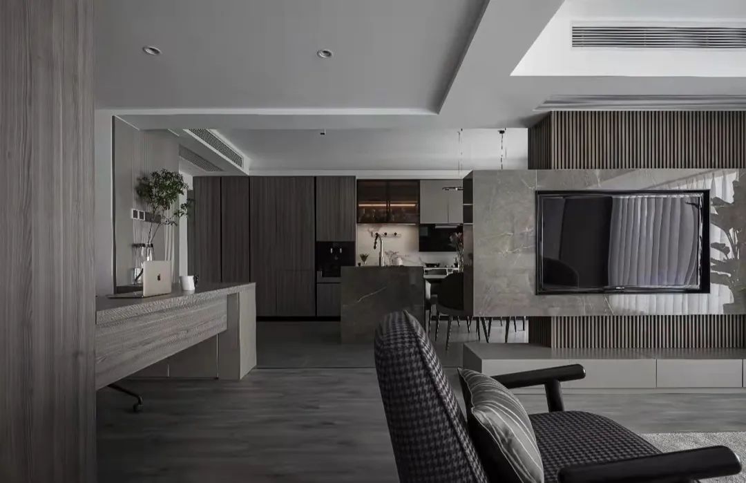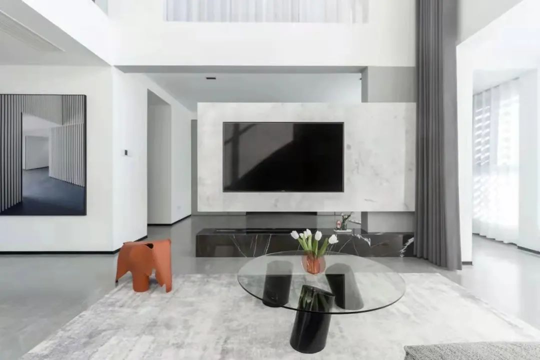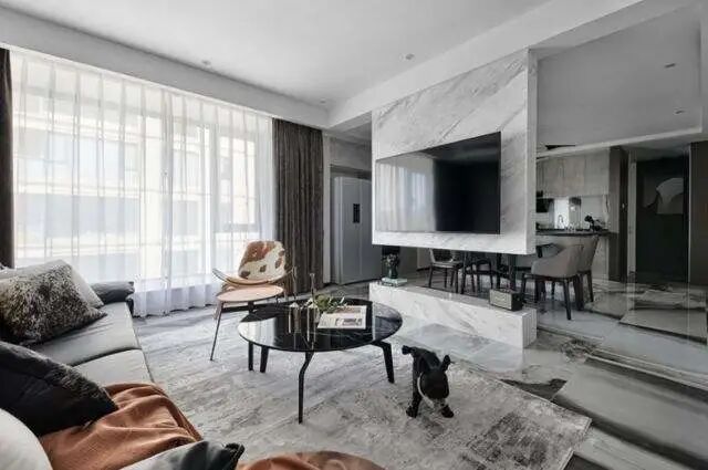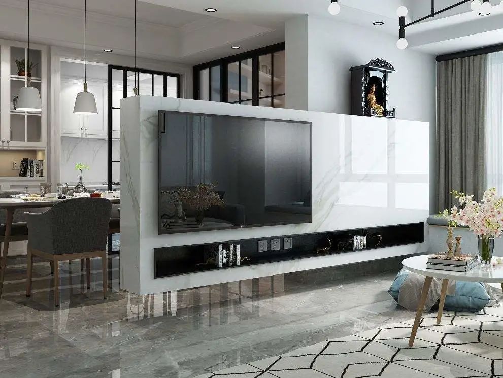 第二种是整个背景墙结构处于悬空状态,看起来更现代更有科技感,既能当做背景墙又能起到隔断的作用,一举多得。因此这种造型的电视背景墙极受年轻人的喜爱。