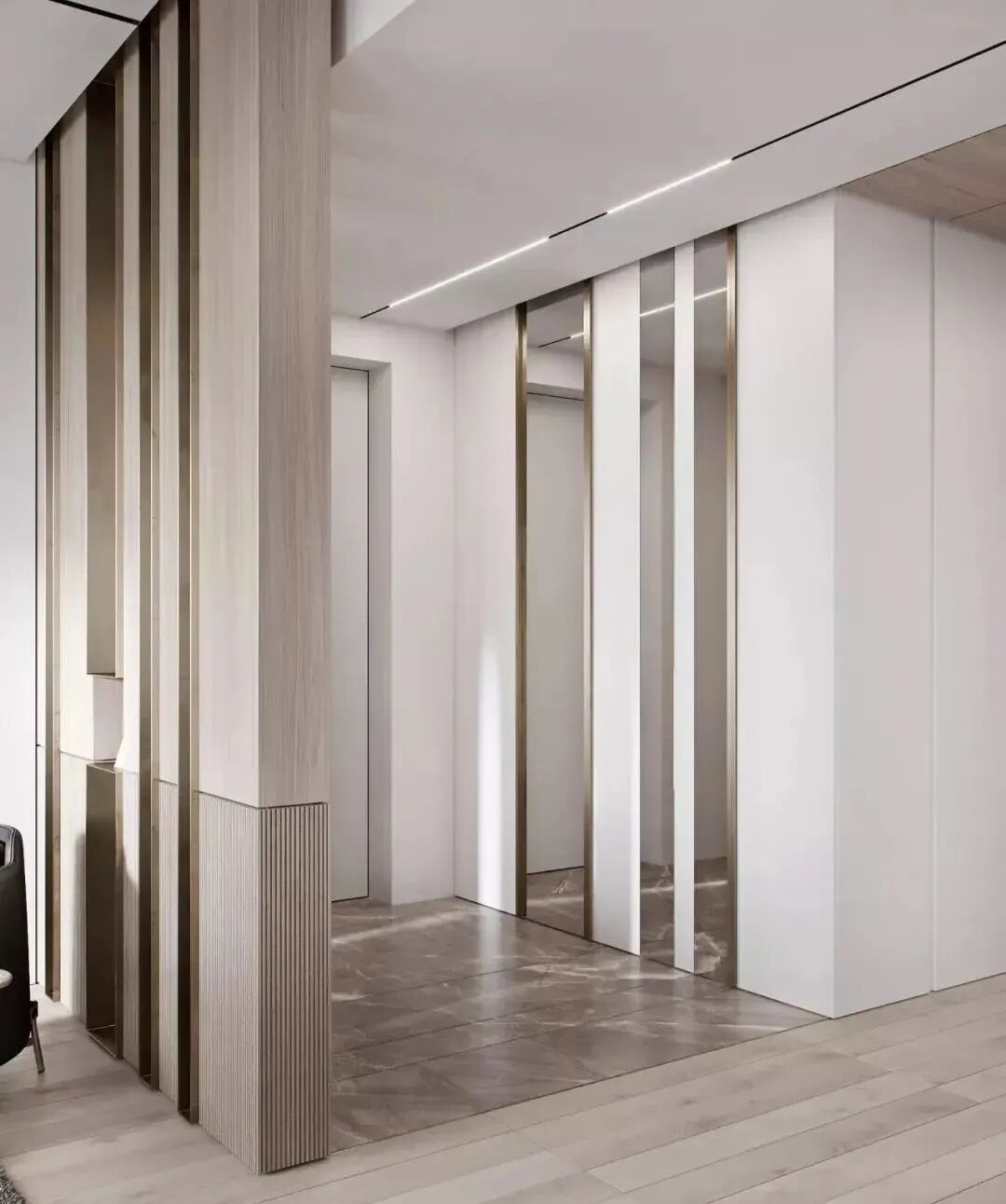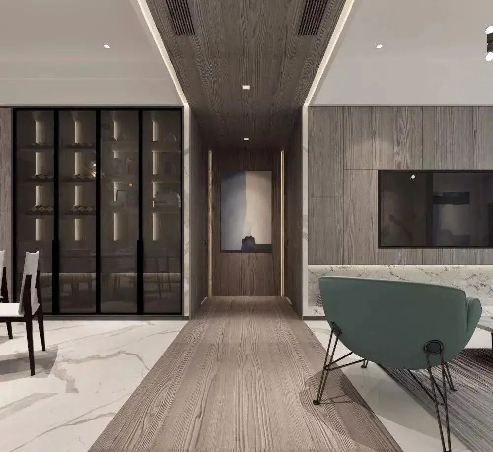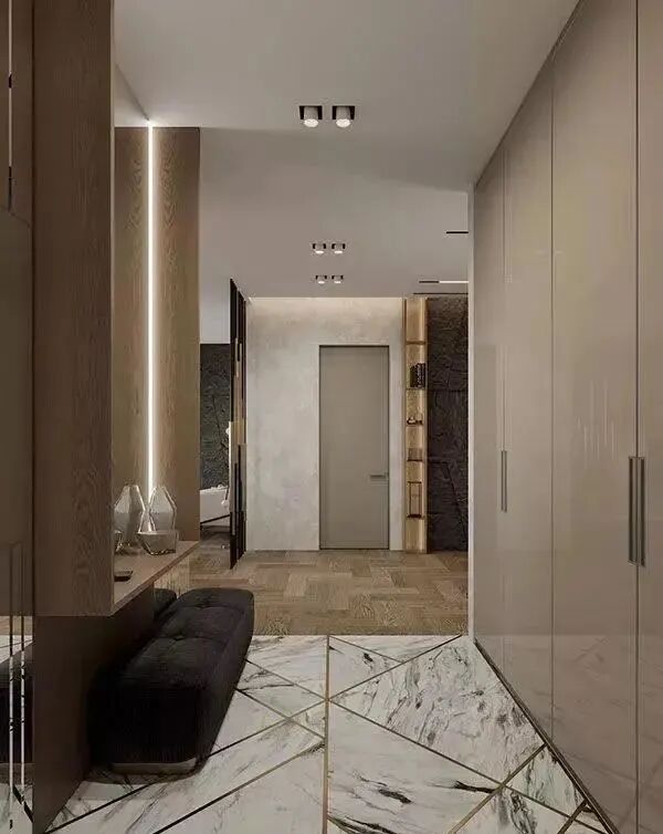 木地板与大理石拼接,不规则的穿插拼接带来更多创意,常见的人字形、鱼骨型,打破呆板,丰富空间设计感。不同的材质运用在不同的空间,通过地面的材质不同发生空间转换。