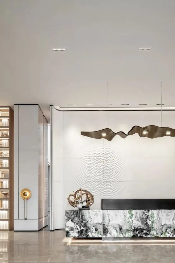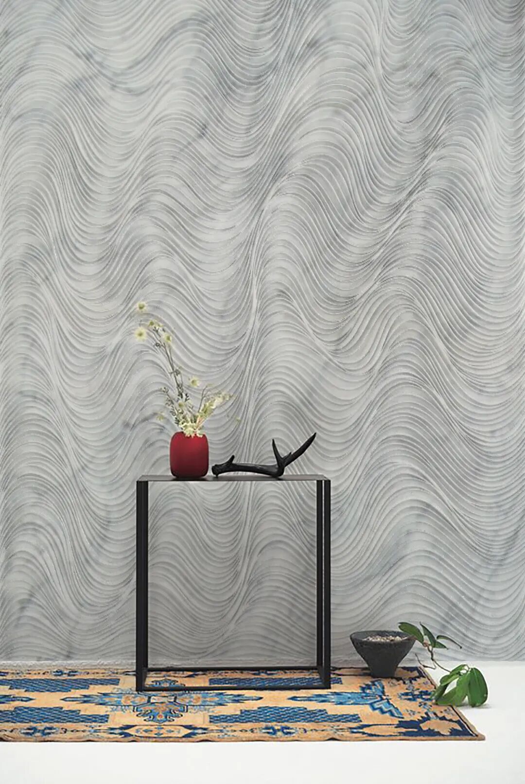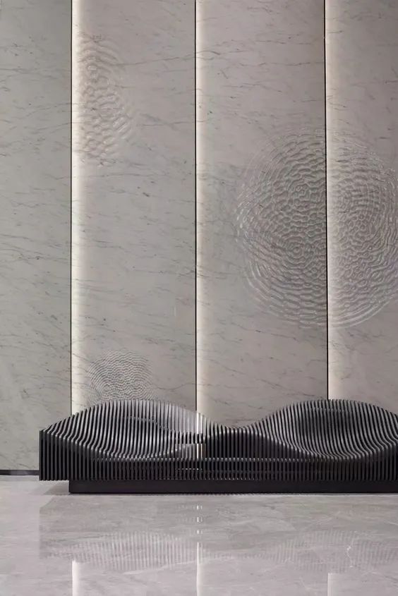 石材表面处理是在石材上进行再加工的一种表现形式,它的物理性能与石材相同,装修效果比石材更胜一筹。除了一些常见的表面处理方式之外,衍生出了许多具有艺术性质的表面处理。让人忍不住去触摸、感受,这就是石材肌理的魅力。一起来看看吧。1.水波纹最近非常流行的水波纹也可以呈现在石材上,灵动的造型让大理石变得更富艺术感。水在风水学中象征着财运,所以水波纹肌理是应用最广泛的造型。