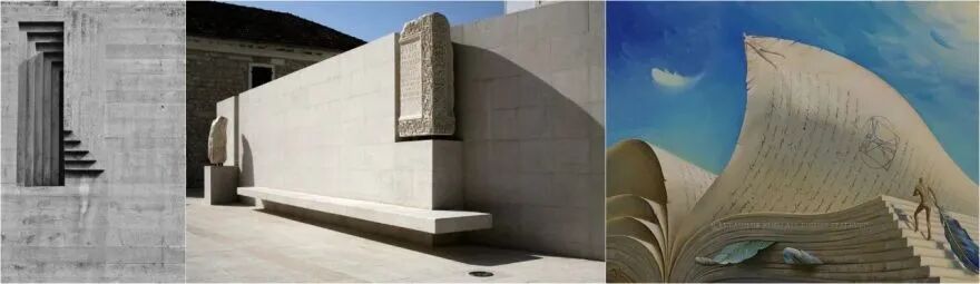 石块构成的台阶,利用镜像引领观者缓步而上,犹如通往未知世界的天梯,体块缝隙间的光带,让厚重的台阶变得轻盈起来。