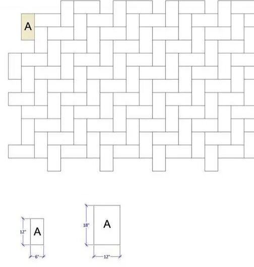 可以用两种或者多种不同颜色的瓷砖拼,比较复古的一种铺贴方式。一定要注意正方形和长方形的尺寸。长方形的长边必须为宽的2倍,正方形边长必须与长方形的宽尺寸一致。