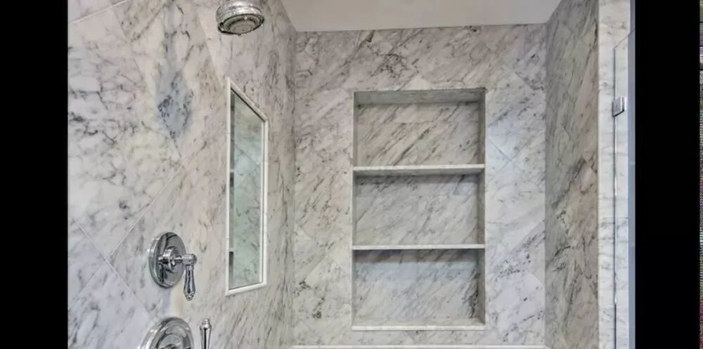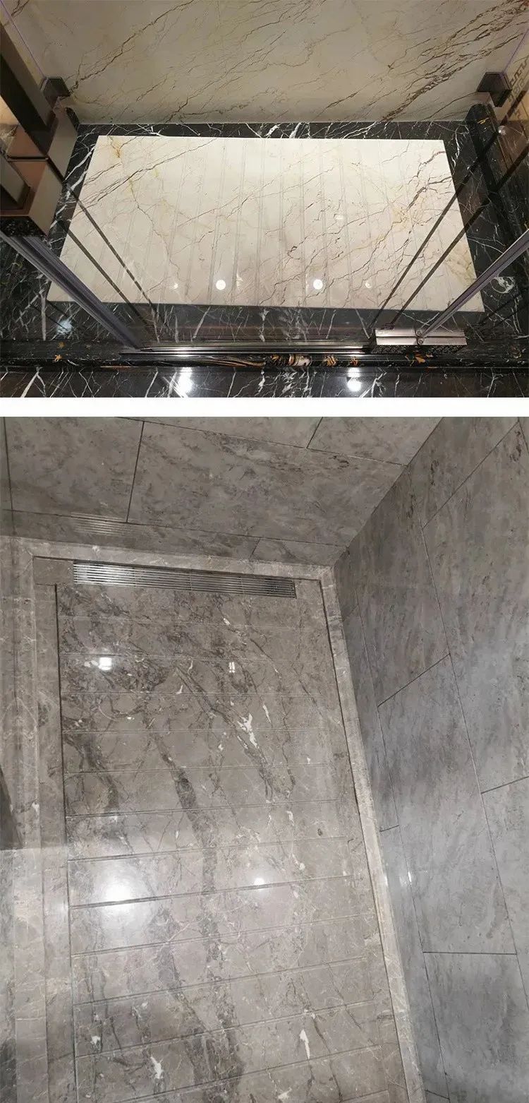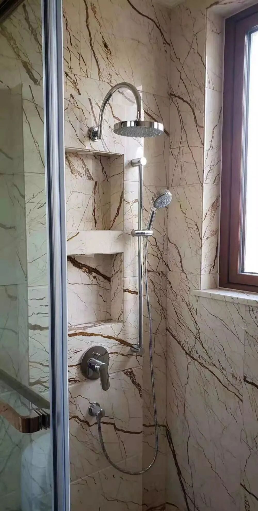 说完挡水条,来说说里面的拉槽,淋浴空间的地面常用拉槽大理石进行铺贴,因为位置特殊,洗澡的时候会有很多水流到地面,如果地面用的是瓷砖,那么就会变的很光滑,站在上面洗澡尤其危险。因此现在很多家庭在装修淋浴房的时候都不用瓷砖了,而选择用拉槽石材。