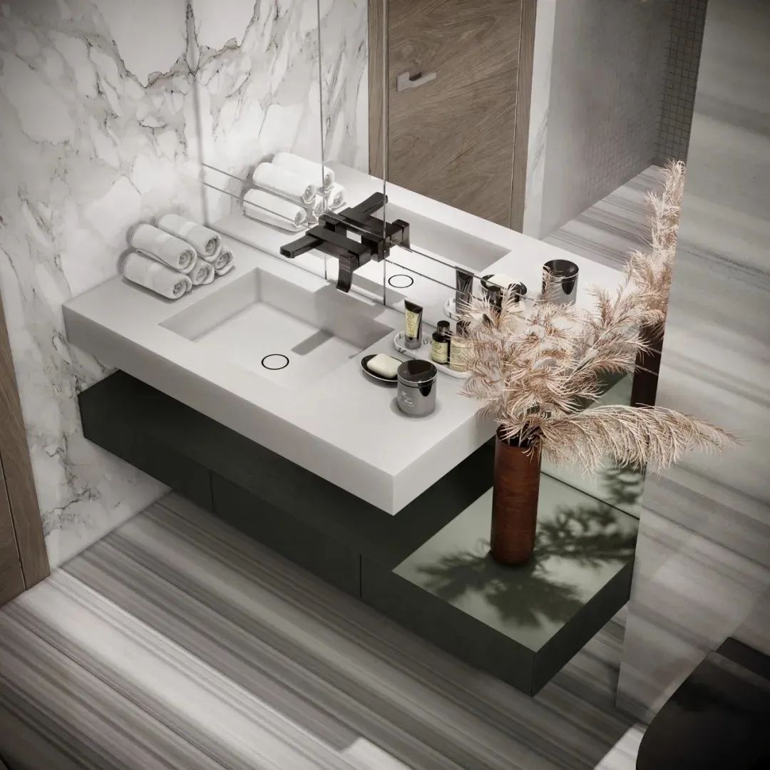 接下来是每个卫浴都必备的台面,天然大理石台面的精美不是普通材料可以比拟的,天然石材庄重美观,格调高雅;且刚性好,硬度高,耐磨性强,物理稳定性好,表面不会起毛边,不影响平面的精度,能够保证长时间不变形,运用在卫浴空间作为台面是十分合适的。