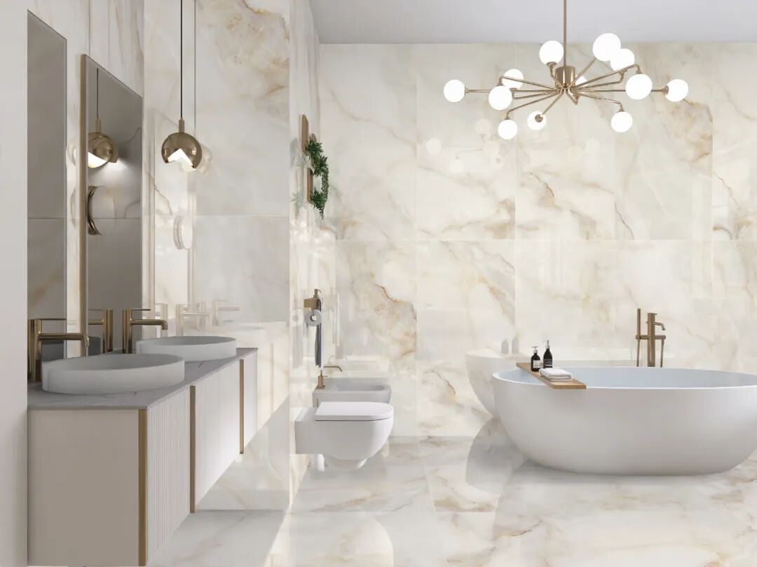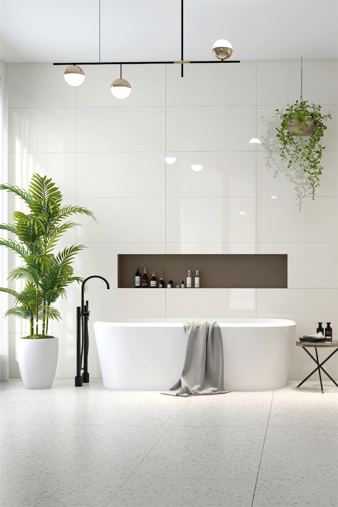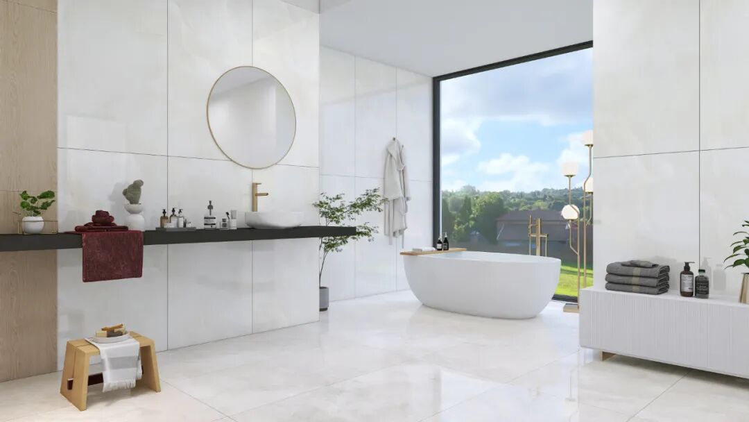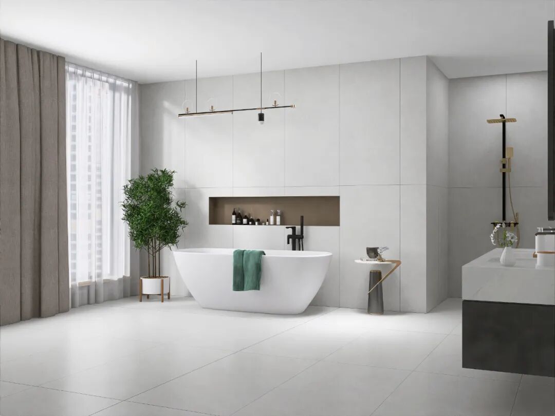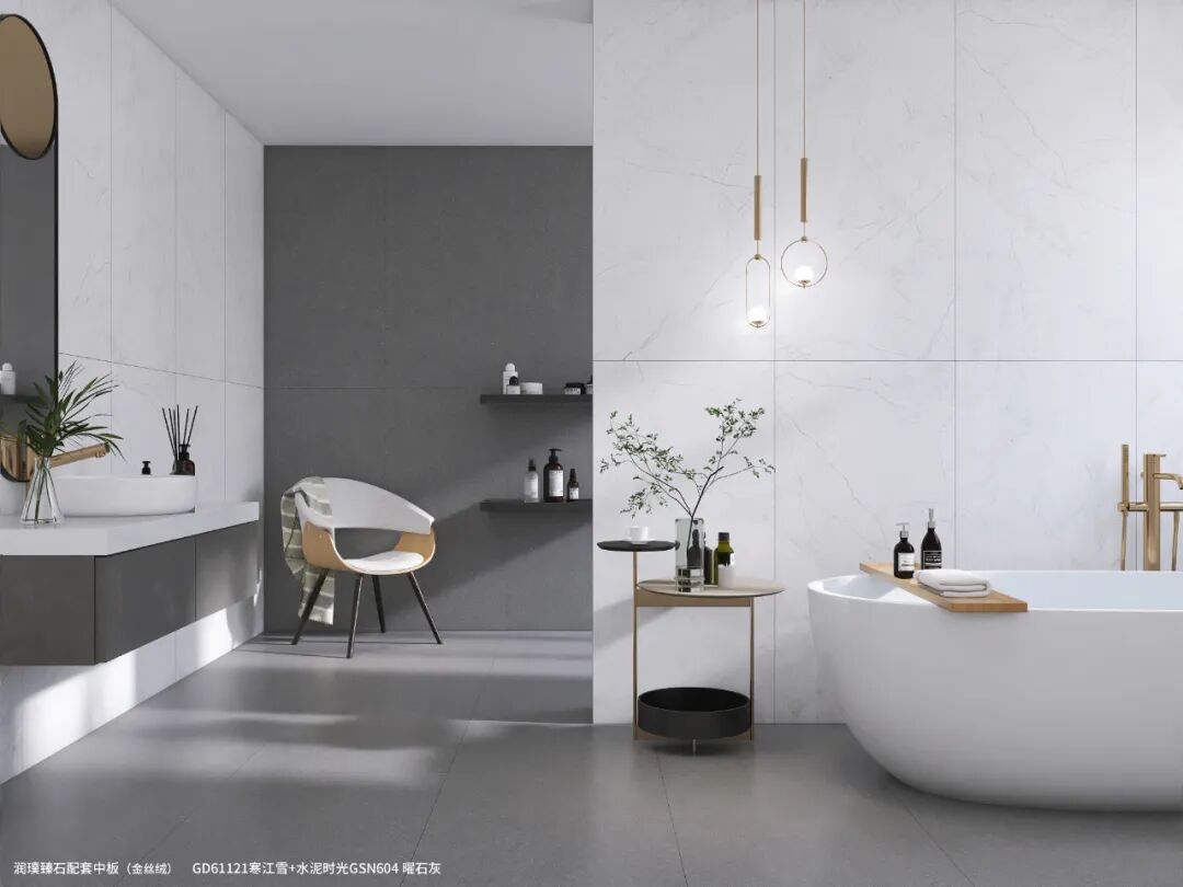 铺贴600X1200mm 润璞臻石小岩板(金丝绒)GD61121 寒江雪,纯洁的白色系瓷砖铺贴在卫浴空间,彰显出空间更为清爽明亮,浑然天成的纹理在砖面上流动,营造出极致简约,高级感满满的空间效果。
