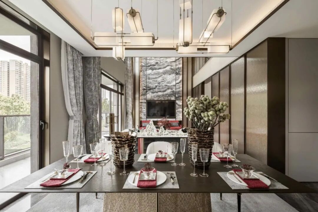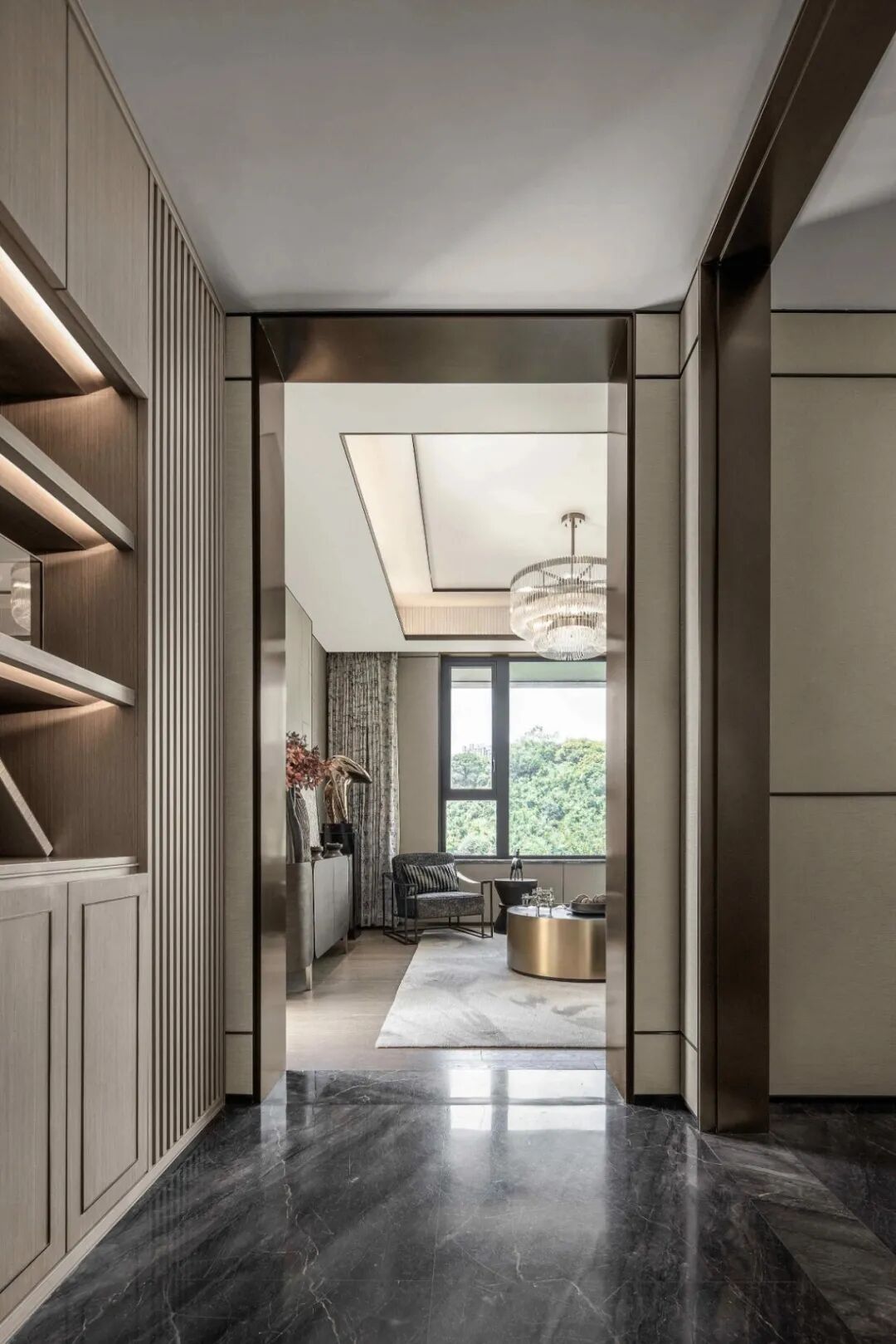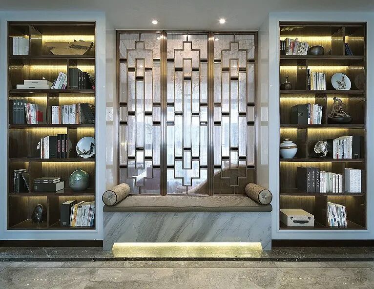 这种传统的审美观念在新中式风格中,又得到了全新的阐释在需要隔绝视线的地方,多用屏风、隔窗、博古架等来切割空间,分割出不同的功能区,通过这种新的分隔方式,单元式住宅也能展现出中式家居的层次之美。