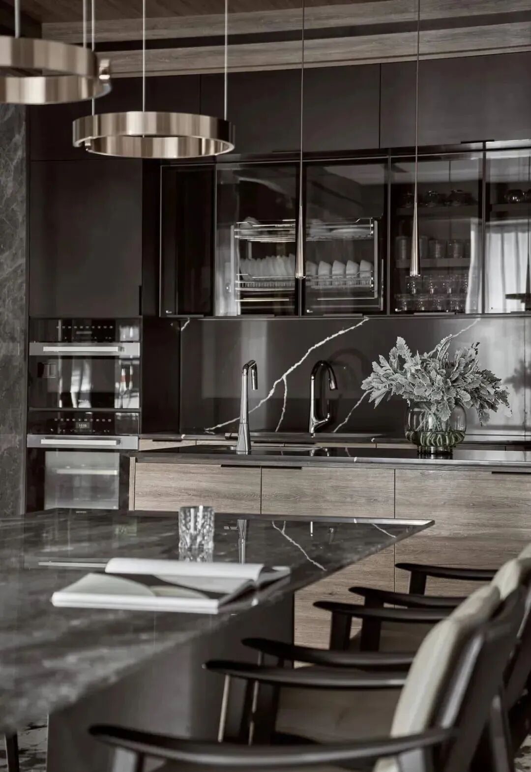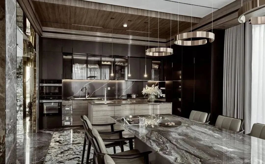 餐厨空间同样使用了很多大理石铺贴,视觉效果强烈,厨房里还有双水槽设计,多人一起使用更方便,二字型台面搭配L型储物柜,不管是操作台面还是收纳都绰绰有余,开放式设计也可以边做饭边跟家人沟通。