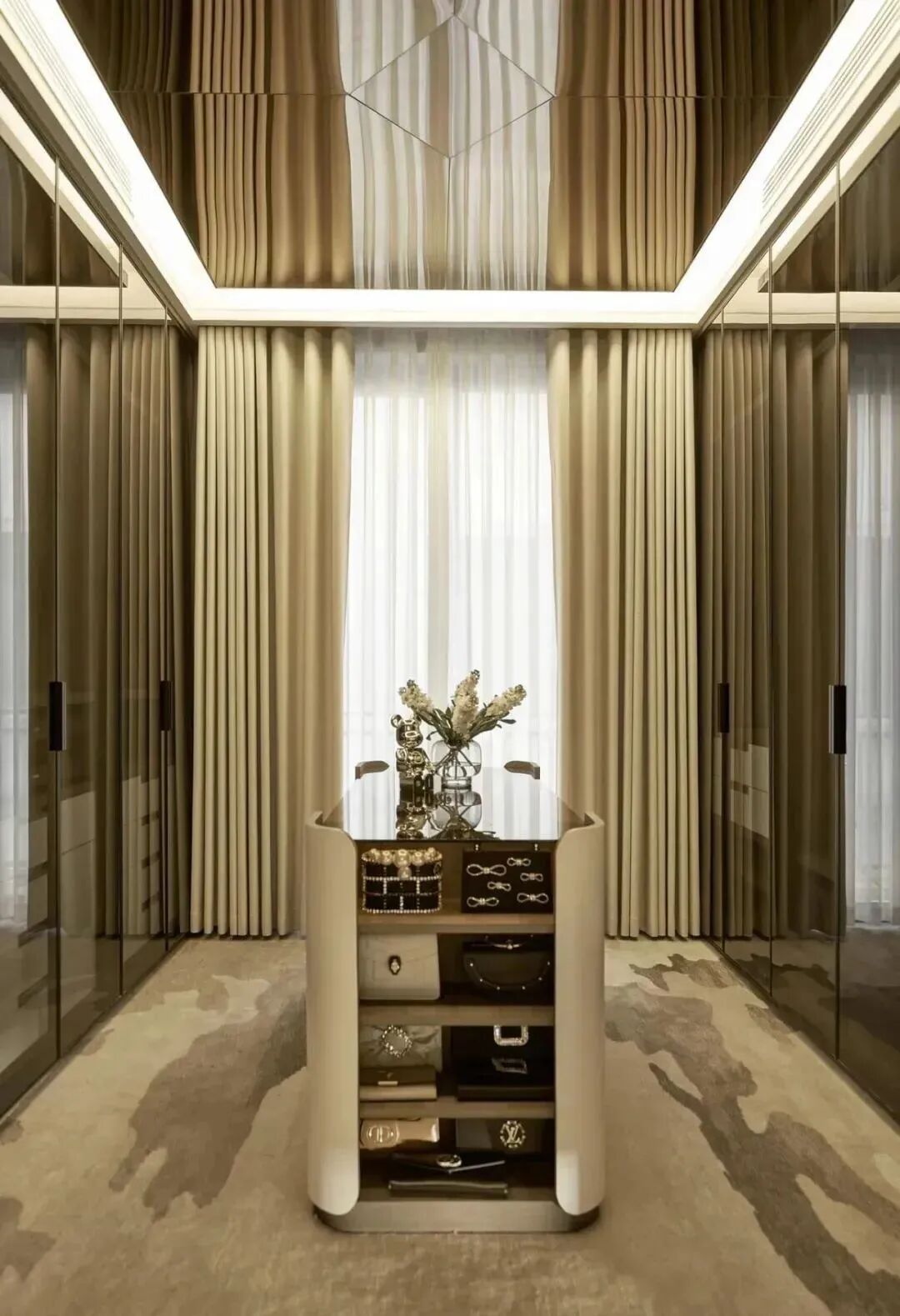 气派的衣帽间,左右两侧全是玻璃衣柜,中间有个首饰柜。