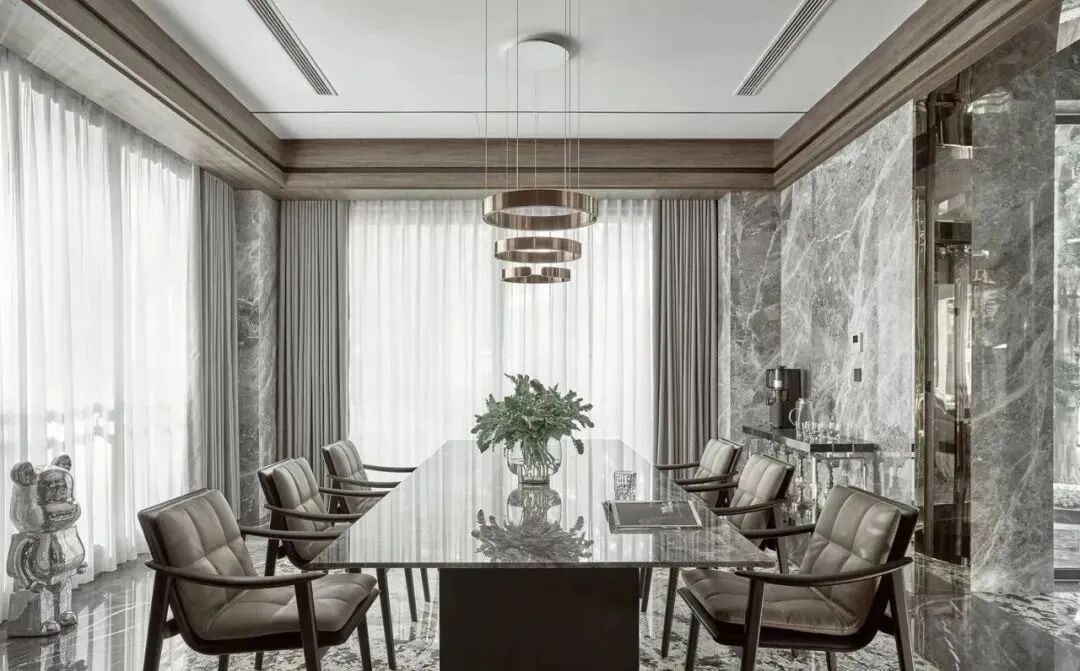 餐厅两侧全是落地窗,光线非常好,长型的餐桌很适合逢年过节人多聚餐,大理石桌面跟地面相呼应,也很好擦洗。