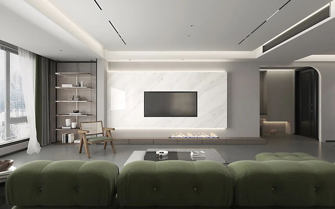 以大理石瓷砖为载体,将轻奢的高贵与雅致恰到好处的彰显于空间之中,新濠超防滑大理石瓷砖通过在130㎡空间里擘画美好体验,展现出与众不同的居住空间。本次采用的主材包括摩卡现代砖系列太古中灰、摩卡现代砖系列爱丽丝深灰、摩卡现代砖系列布莱恩、摩卡现代砖系列卡杜拉浅灰、镜面理石系列云雾白。在客厅空间中,设计师通过大面积的采光玻璃将天然光线引入室内,生活,也随之被带入与自然之间的对话。其以 750x1500 mm微水泥-太古中灰为地面主砖,一石四面的无限连纹设计,为空间平添流动的生命力,搭配 白背景墙面,和墨绿色的布艺沙发,色彩上的轻叠搭,与整体低饱和度基调相互融合,彰显空间细腻层次质感。