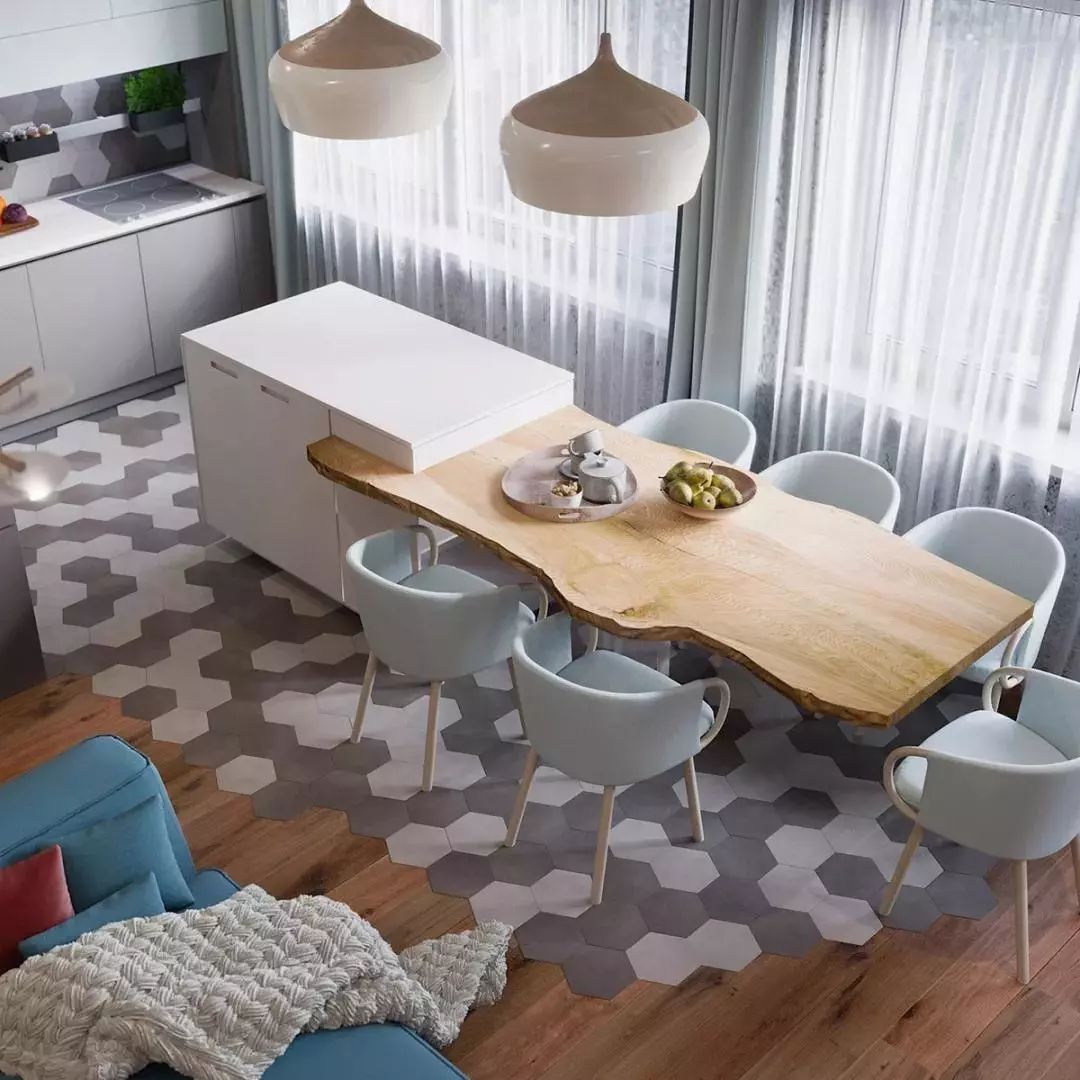 更为高阶的铺法,因为有孩子的家庭应避免地毯的使用,混搭式拼法颜值超高,自带结界感,可以更好的划分开放型的空间,例如在开放式厨房和餐厅之间,或者门厅与客厅之间。同样的对客观条件的要求相应更高,交接处的收口问题需要尤为注意,同时尽可能的避免出现高度差。