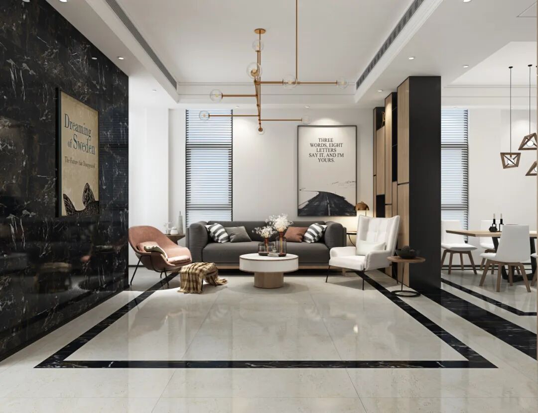 对于大面积的空间,可以选择使用深色的地砖来制造一种深邃感,同时可以选择用浅色调为主的墙面进行调和,或者使用柔软质地的窗帘、色彩明艳的抱枕等等进行空间的提亮与点缀,突出空间的活泼感和舒适感。