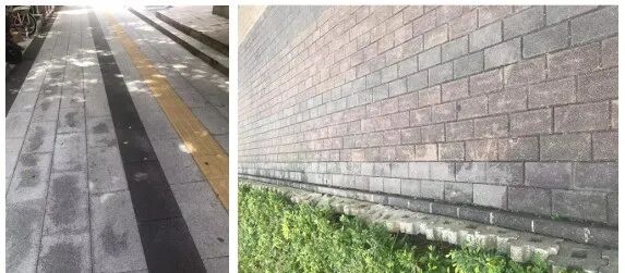 PC砖表面充满了黑色的脏物,有如碳黑了,而花岗石石材表面依旧是原本的颜色。PC砖的抗污能力差是其致命的问题,也是影响其以后向前发展的问题。