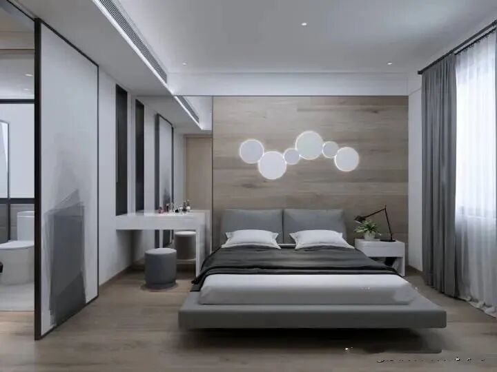 定制的床给人一种悬浮的设计感,而旁边则是梳妆台,室内的空间非常大,带有个卫生间和衣帽间。而且就连隔断都是用的艺术画做背景移动门的背景,如果不知道还以为这里面是个衣柜。