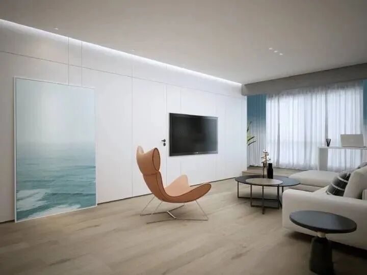 客厅的电视背景墙还带有个隐形门,背后就是卧室的空间,而其他的背景墙则是做了分割线的设计,为了不让背景墙太过于单调,摆放一整块大面积的装饰画,有点像是蓝色的大海和白云的搭配,很有艺术感。