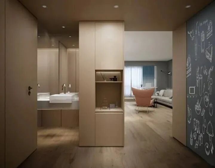 从这边过来就是进入到主卧室过道,而整个过道上为了不那么单调,而且还可以给小孩子更多的创新空间,直接把一面墙做成了黑板墙,以后小孩子想要涂鸦都没有问题。另外一边的入口则是卫生间,有点酒店风格的设计。