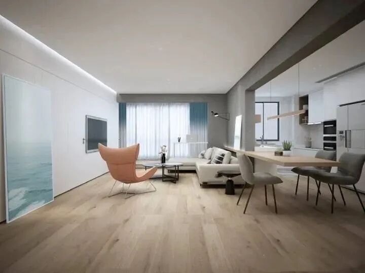 经过餐厅进来后可以看到整个客厅空间非常的舒适和宽敞,而且实木的地板更为大气和温馨了,客厅的天花板也是极简主义的设计,一整块白色吊板,还有设计了隐藏的灯带,这样看起来让人觉得更舒适。