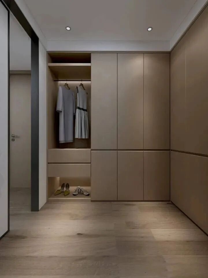 衣帽间的空间很大,中间就差放一张沙发圆凳了,整个空间收纳性能很强,而且鞋子都可以放很多双了,不需要担心玄关的鞋柜会太小。整体空间用的是实木的材料作为装饰,很是实用和温馨。