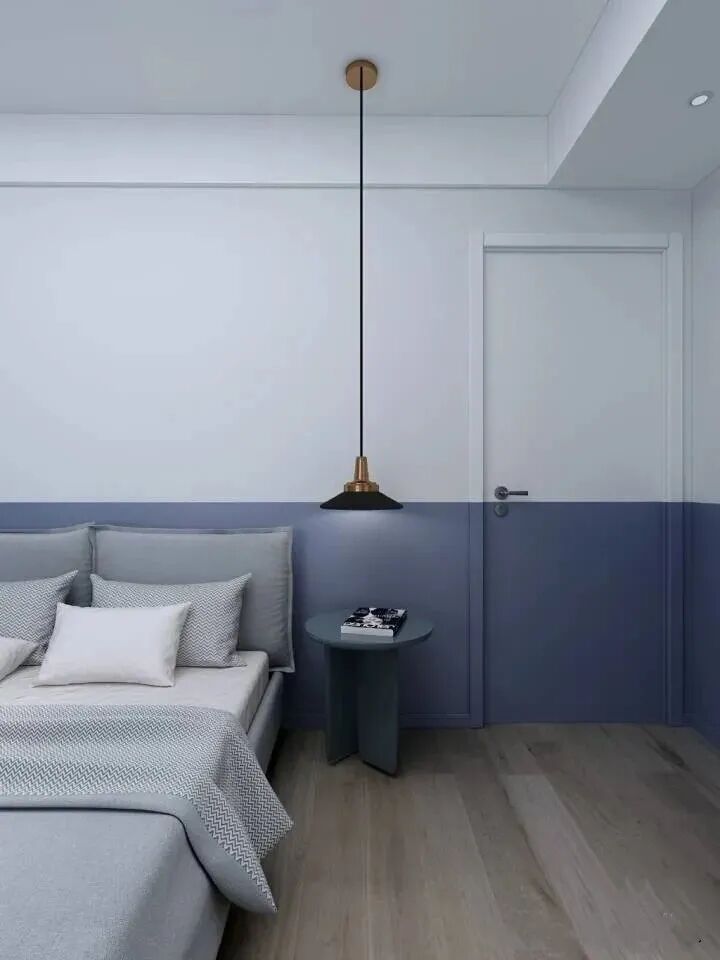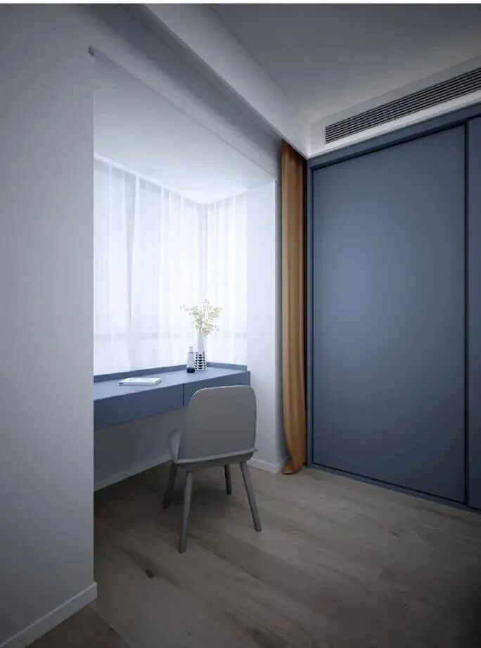 侧卧,这边就是电视背景墙后面的空间,门和墙面做了融合的设计,刷了同样的乳胶漆这样看起来整体感很强,而且整个空间的装饰也很简单,实用为主,比如利用窗边的空间定制的足学习桌,灰色的床以及蓝色的背景很是时尚和大气。