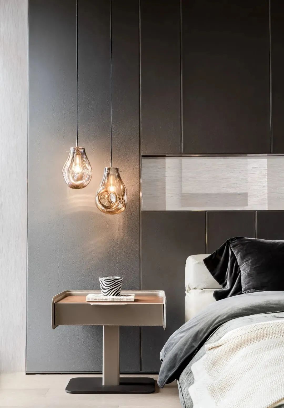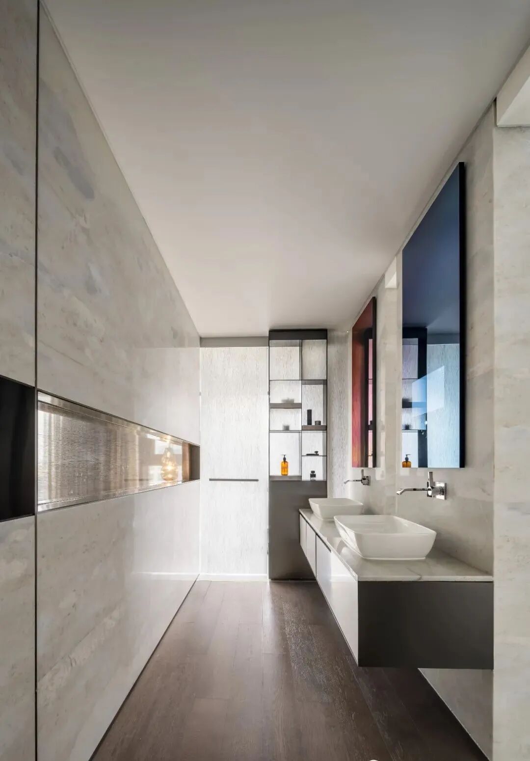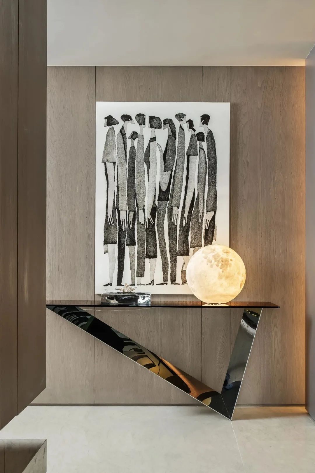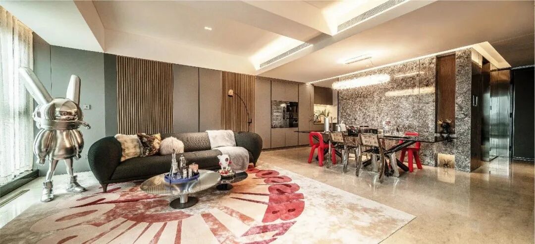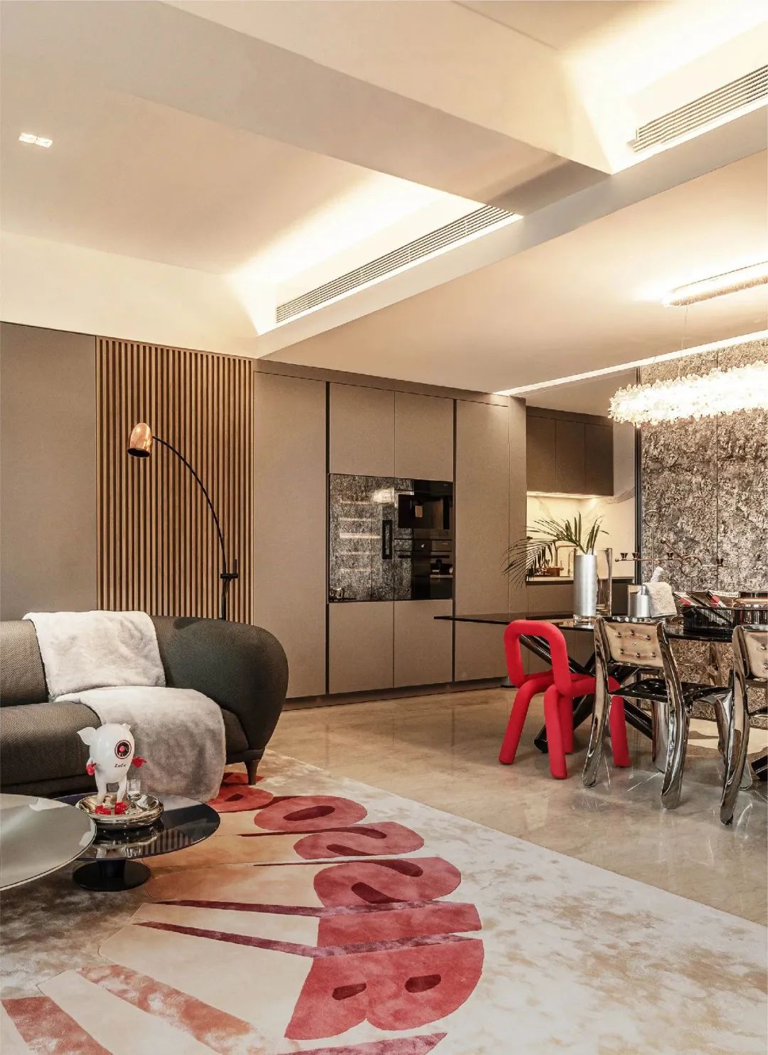 客厅以木饰面打底,其间镶嵌凹槽,让空间彰显现代的人态度:简单,不一定美;但美,一定是简单的。