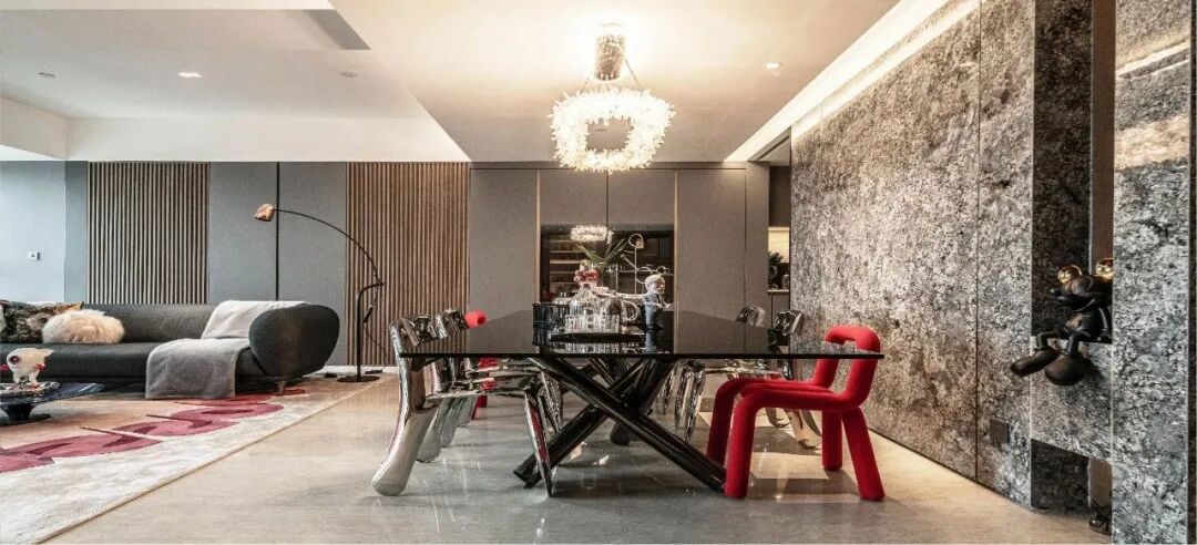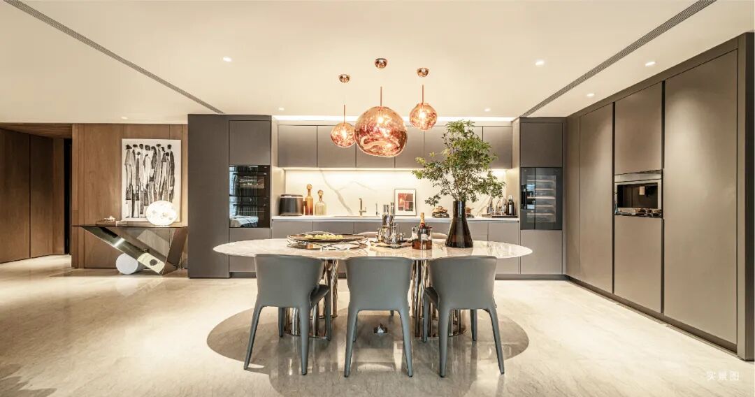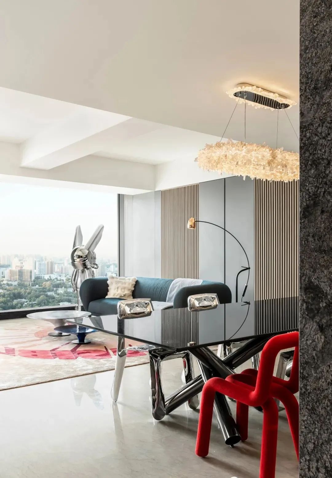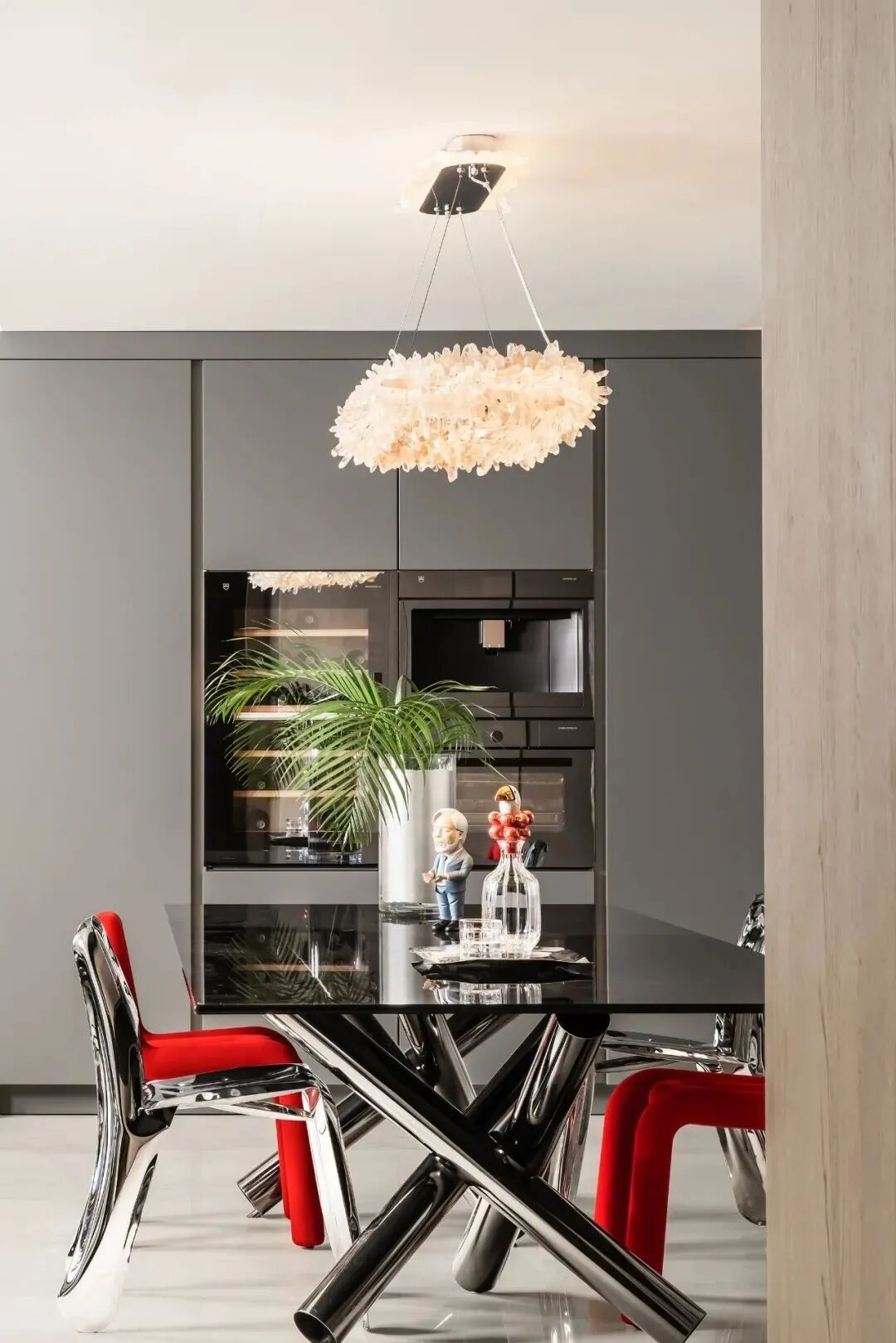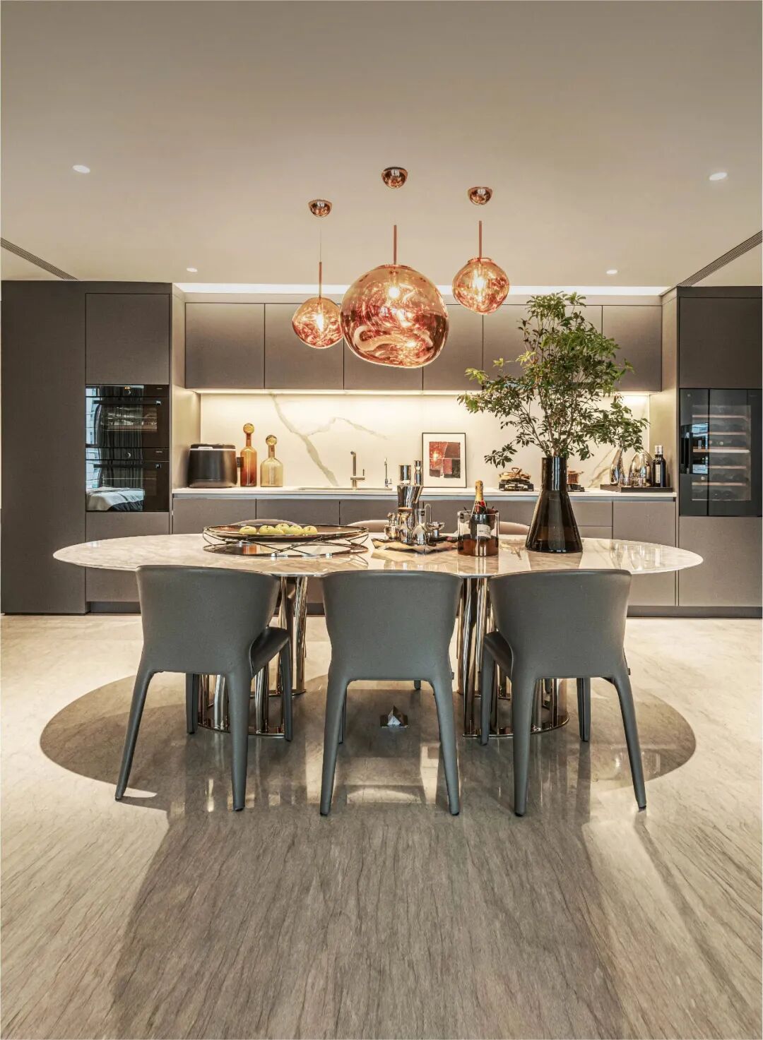 客厅与餐厅毗邻让空间更具互动性,也增强了居住与社交融会贯通的物理属性。餐桌椅特别选取时尚前卫的造型设计,简约而经典,谱写出生活的不慌不忙。