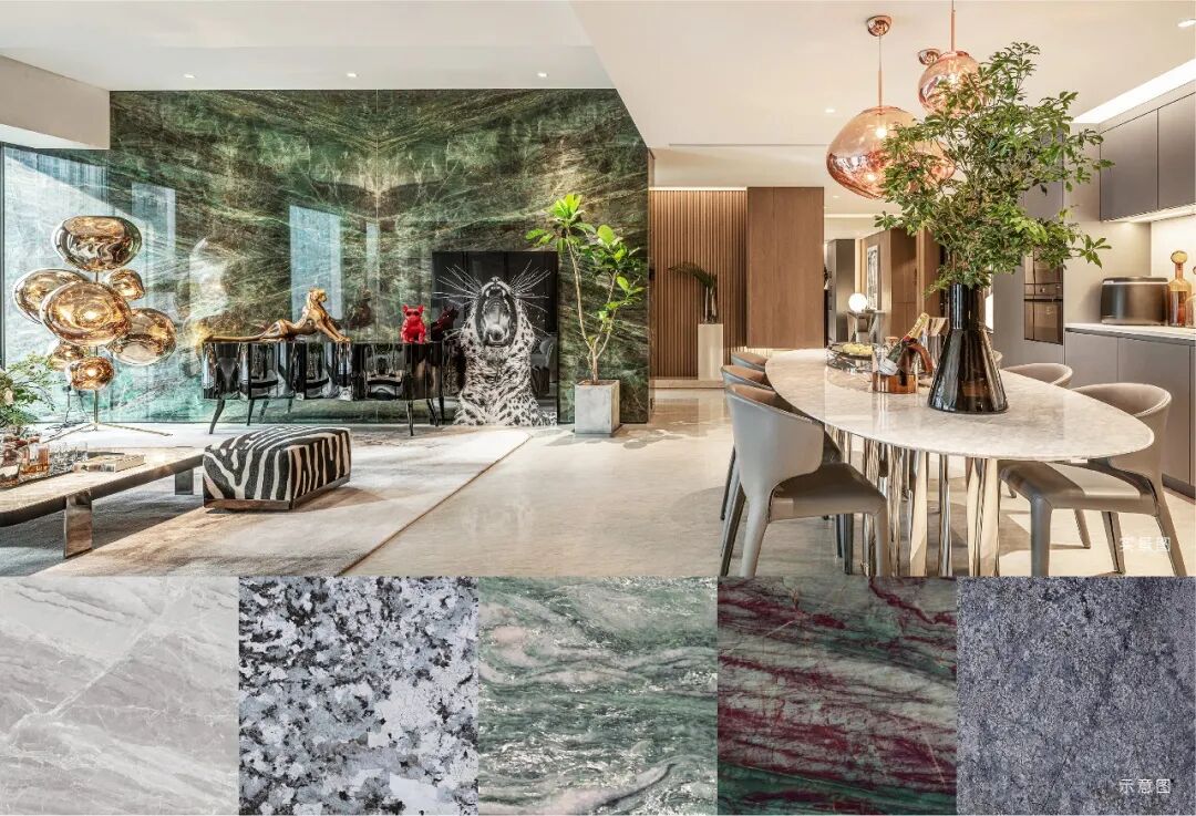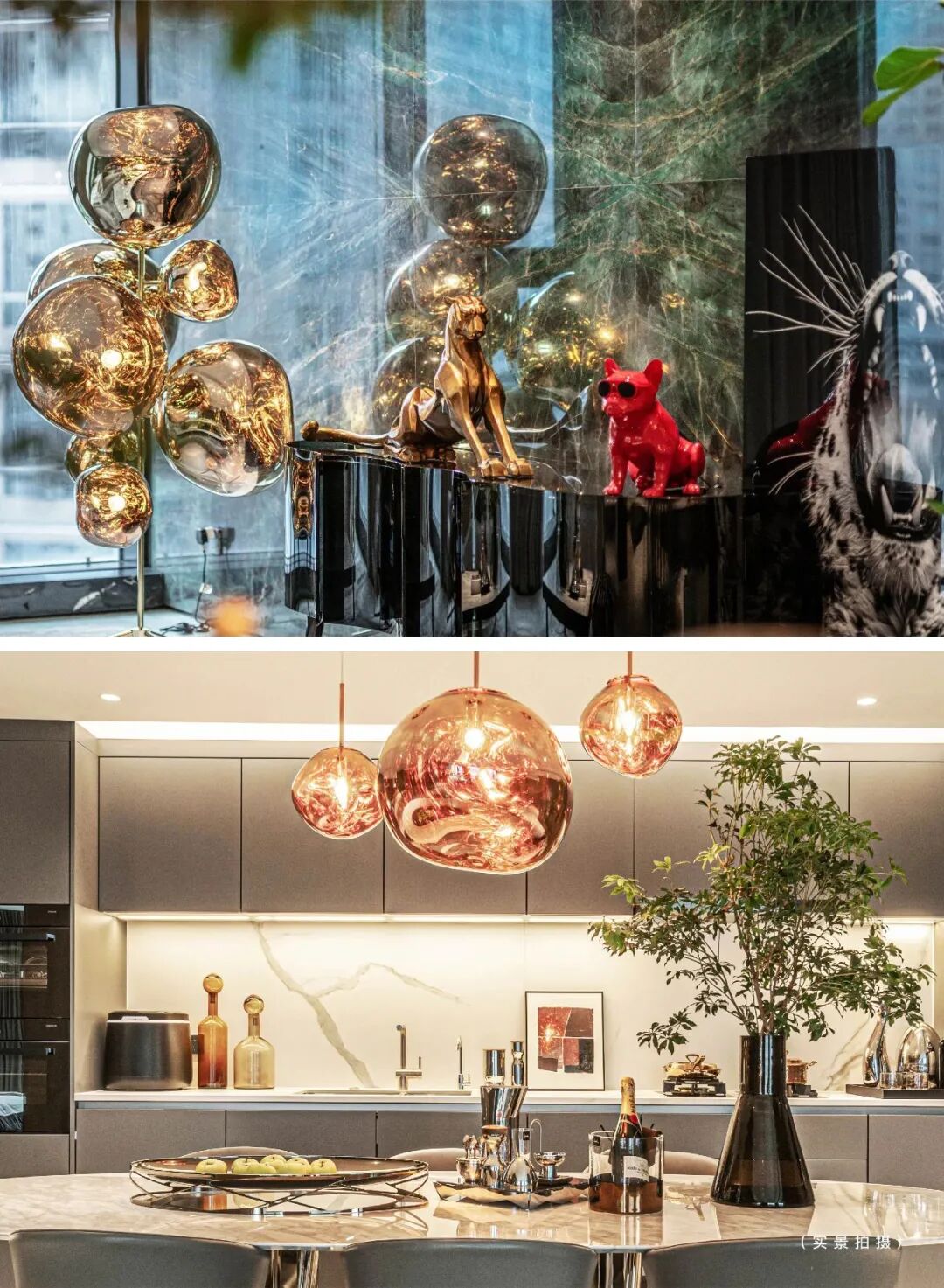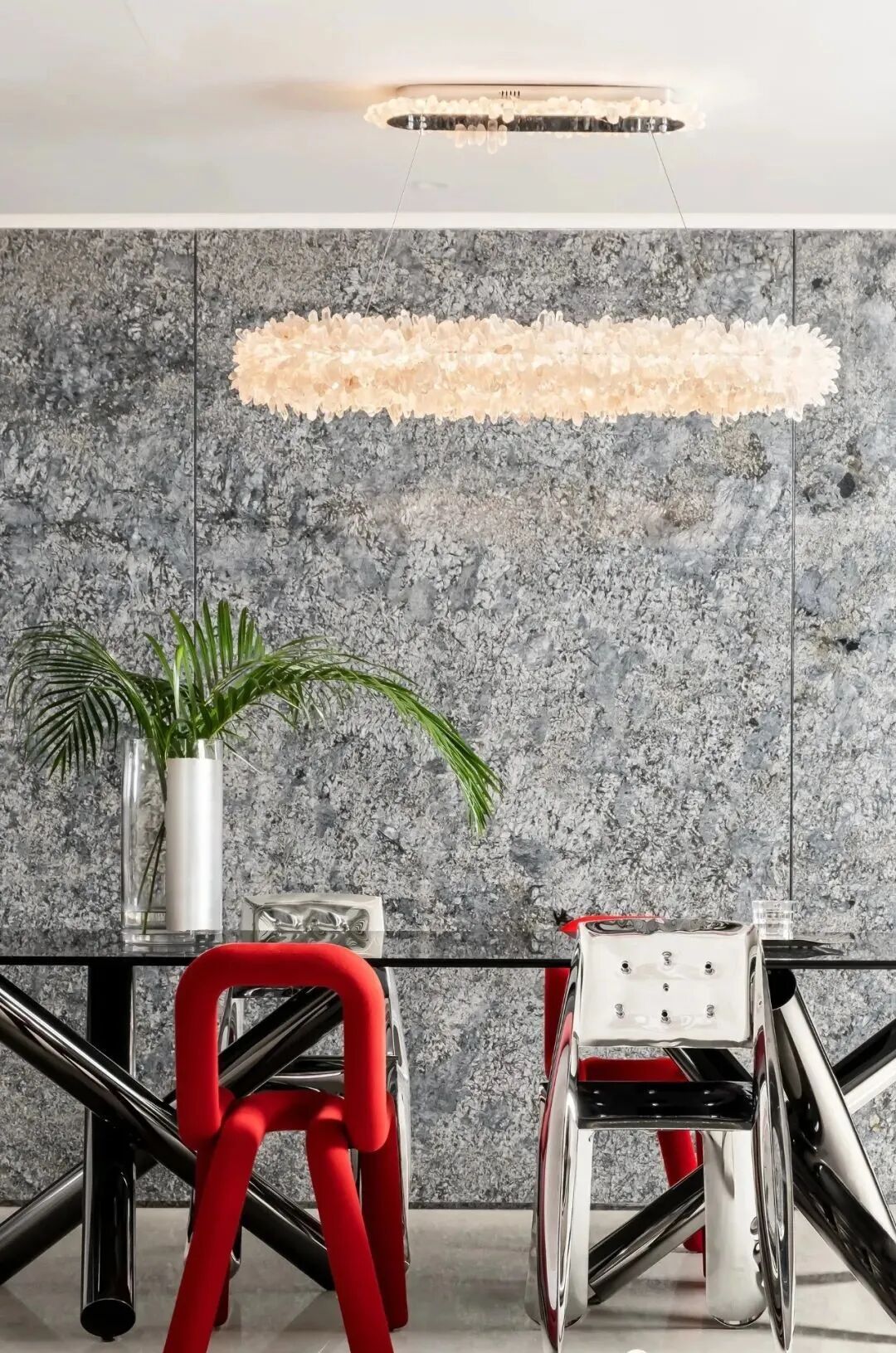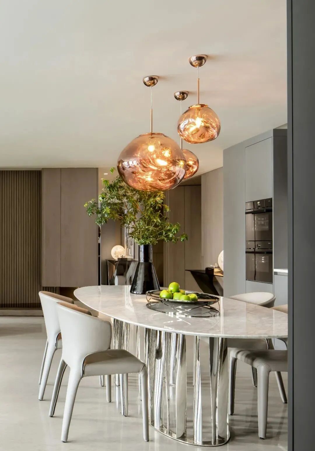 客厅与餐厅毗邻让空间更具互动性,也增强了居住与社交融会贯通的物理属性。餐桌椅特别选取时尚前卫的造型设计,简约而经典,谱写出生活的不慌不忙。