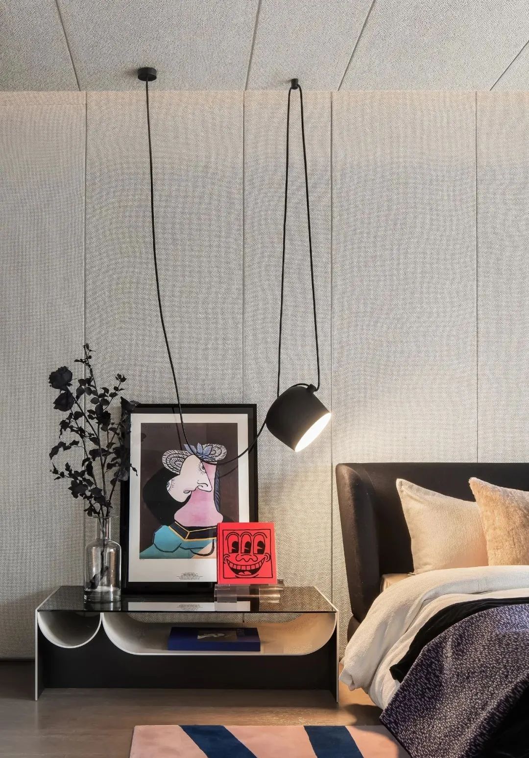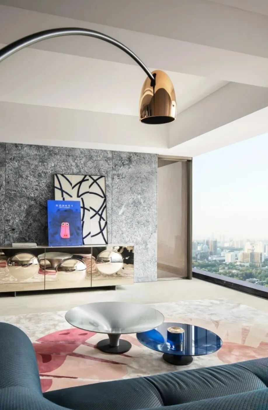 蓝色渐变的沙发、时尚简约的茶几组合,玫红色地毯,干净利落的背景衬托下各得其所,进而体现都市女性生活态度