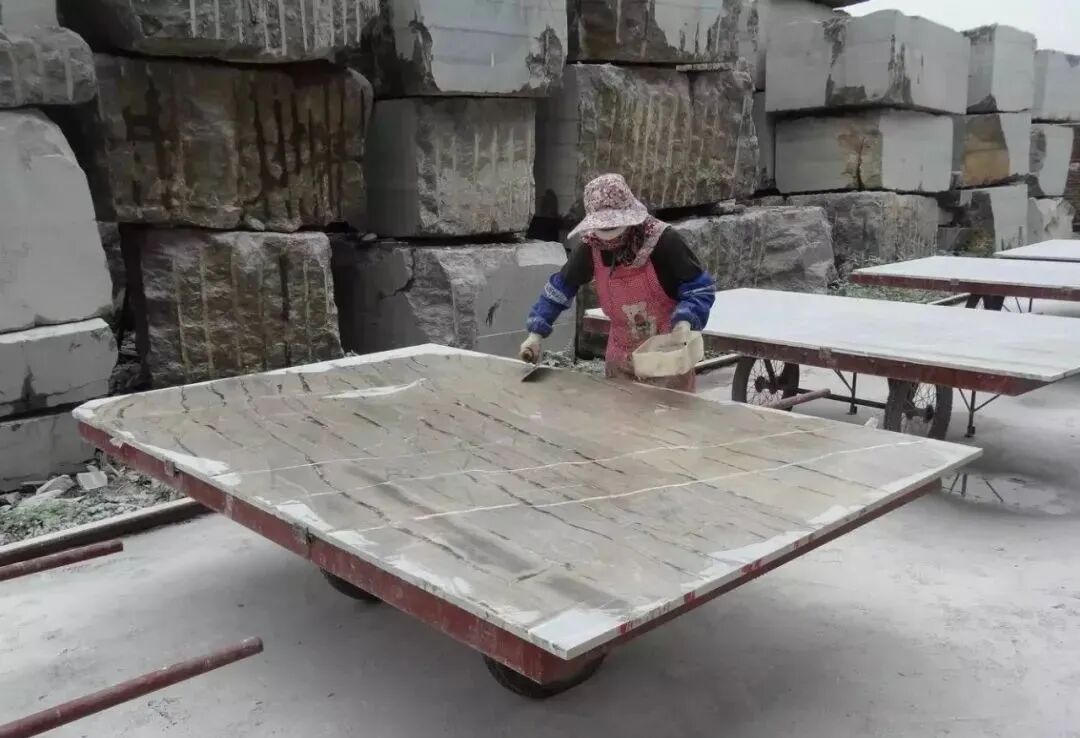 大理石拉锯荒料切割→双面背网→对剖→定厚(粗磨)→正面刮胶→手扶磨磨光→切边→排版(补胶)→再加工→检验→防护→包装