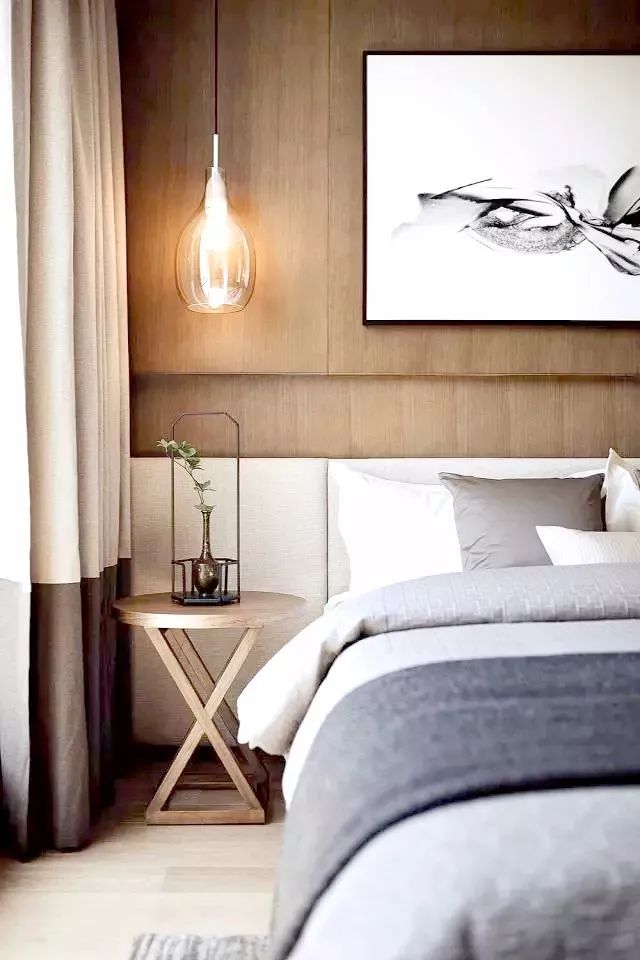 所以,大家会更多地利用大面积的白色、木色和其他纯色,来提升视觉和心理的舒适度,不容易有压迫感。而看似自然随意的灯饰点缀,也可以提供一些温馨柔和的光源,伴你安心入眠。