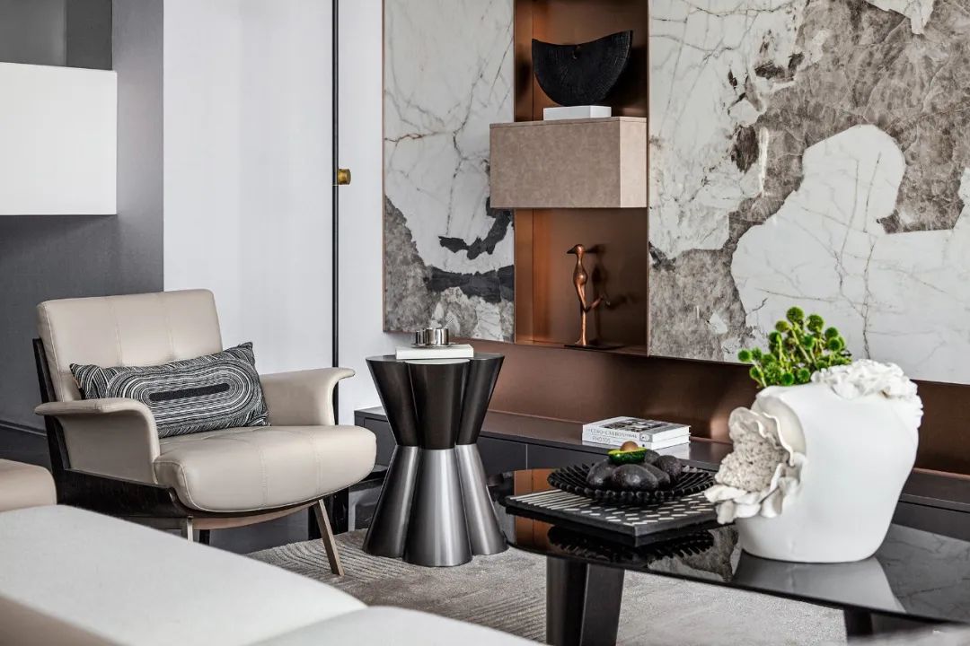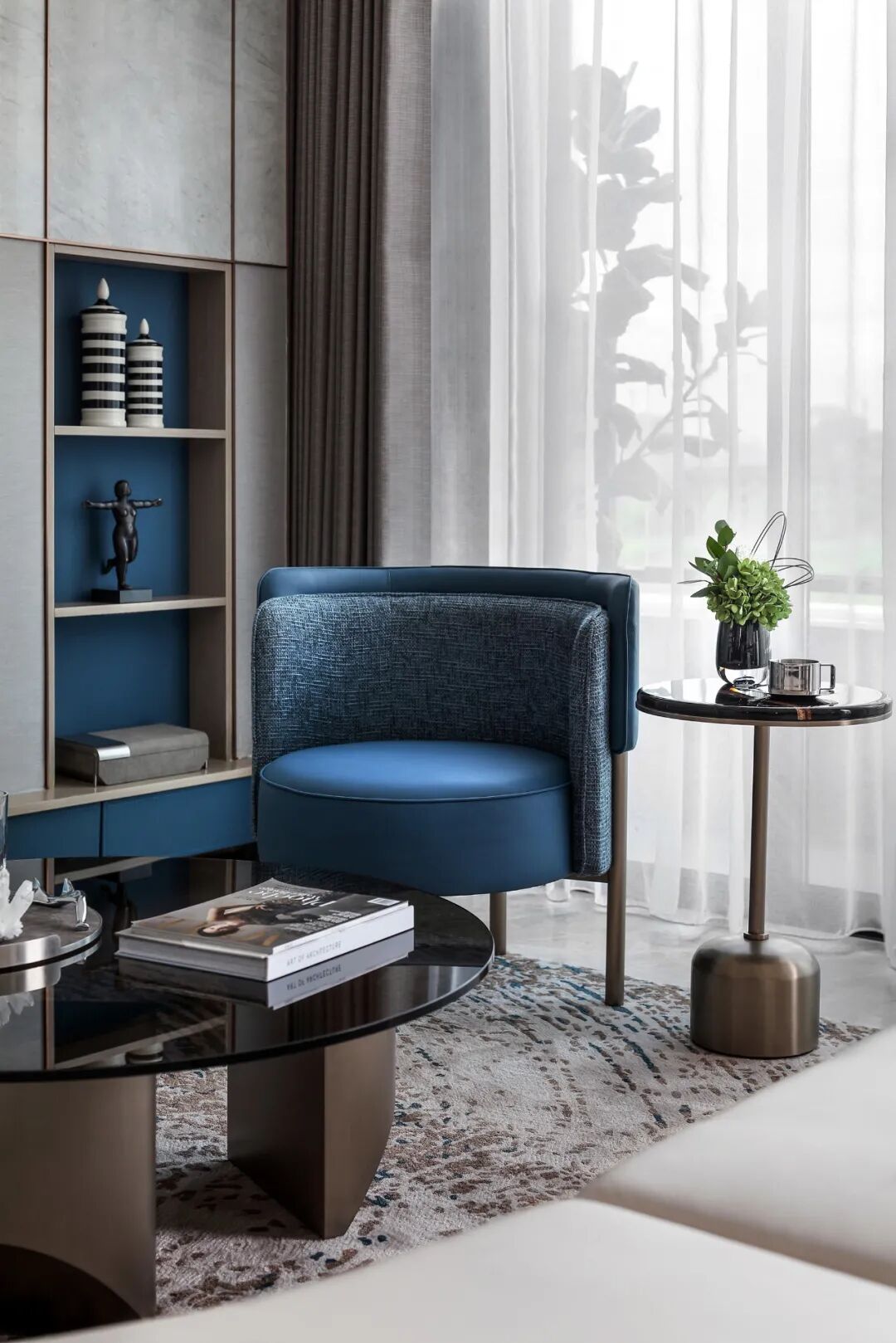 弧形沙发同样以块面组合的结构样式回应着空间中建筑之美,且以圆弧角度柔和着几何硬朗的调性。